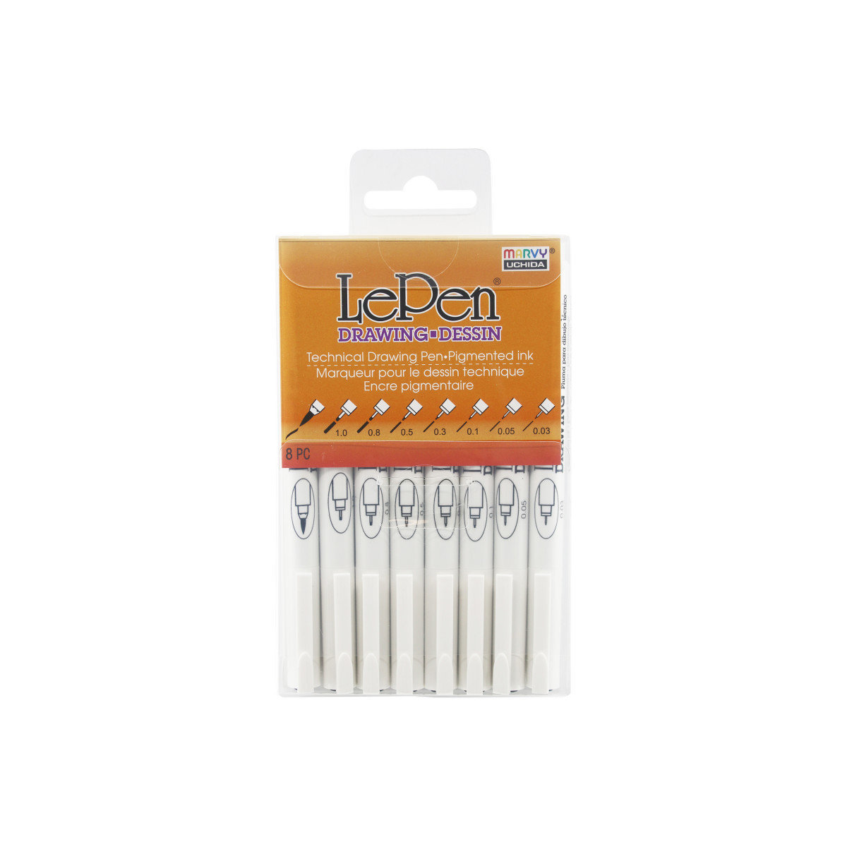 Achieve crisp, professional-quality lines with the Le Pen Drawing Pens, Black, Assorted Sizes, Set of 8 by Marvy Uchida®. Designed for artists, illustrators, designers, students, and journalers, this set includes eight essential points, 0.03, 0.05, 0.1, 0.3, 0.5, 0.8, 1.0, and a brush tip, for everything from ultra-fine technical detail to bold strokes and expressive linework. Each pen is filled with water-based, pigmented ink that is lightfast, archival-quality, acid free, non-toxic, fast drying, and smudge resistant, ensuring long-lasting clarity and precision. The ink flows smoothly and consistently, making these pens ideal for sketching, outlining, technical drawing, hand lettering, journaling, manga, and mixed-media artwork.