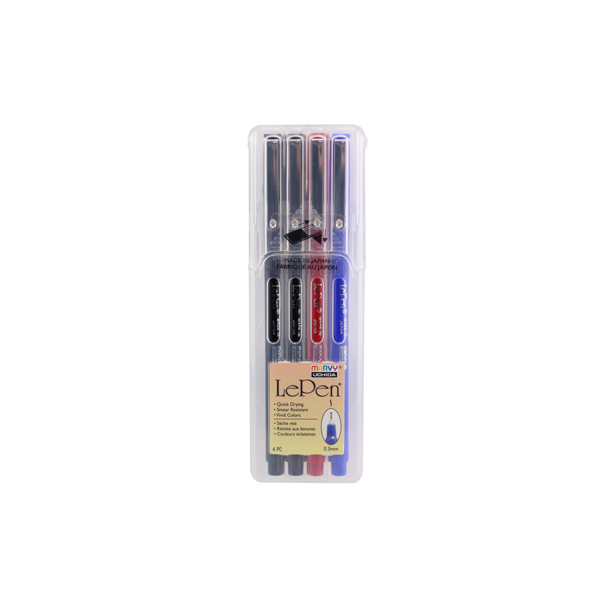 Create clean, precise lines with the Le Pen® Drawing Pens, Basic Colors, 0.3 mm Tip, Set of 4 by Marvy Uchida®. Designed for artists, students, planners, designers, and journalers, this set includes four essential colors, (2) Black, (1) Blue, and (1) Red, each equipped with a reliable 0.3 mm fine tip for crisp, controlled writing and detailed illustration. The water-based, pigmented ink is acid free, non-toxic, lightfast, and smudge resistant, ensuring long-lasting clarity on paper. These pens deliver smooth, consistent flow ideal for outlining, sketching, handwriting, labeling, bullet journaling, and technical drawing. Fast-drying ink prevents smearing, while the fine point maintains sharp line quality for precise work.