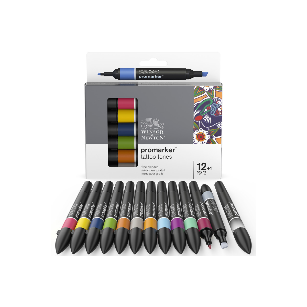 Create bold, high-impact illustrations inspired by tattoo artistry with the Winsor & Newton Promarker™ Tattoo Tones, Set of 12+1. This versatile collection includes 12 Promarkers, Lipstick Red, Pumpkin, Sunflower, China Blue, Indigo Blue, Plum, Forest Green, Green, Spice, Burgundy, Warm Grey 4, and Ice Grey 4, plus one Promarker™ Blender, offering everything you need for dramatic shading, vibrant color layouts, and expressive flash-style designs.