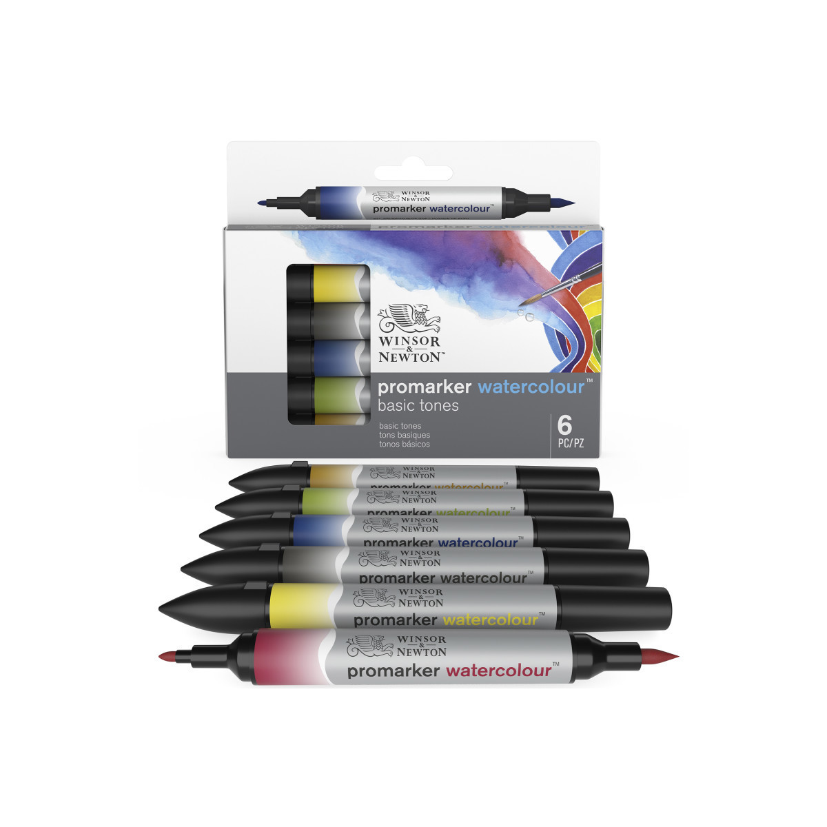 Create beautiful watercolor effects with the ease and control of a marker using the Winsor & Newton Promarker™ Watercolor, Basic Tones, Set of 6. Designed for artists who love expressive color with minimal setup, this set includes Alizarin Crimson Hue, Cadmium Yellow Hue, Ivory Black, Prussian Blue Hue, Sap Green, and Yellow Ochre, a foundational palette that supports mixing, layering, and traditional watercolor techniques.