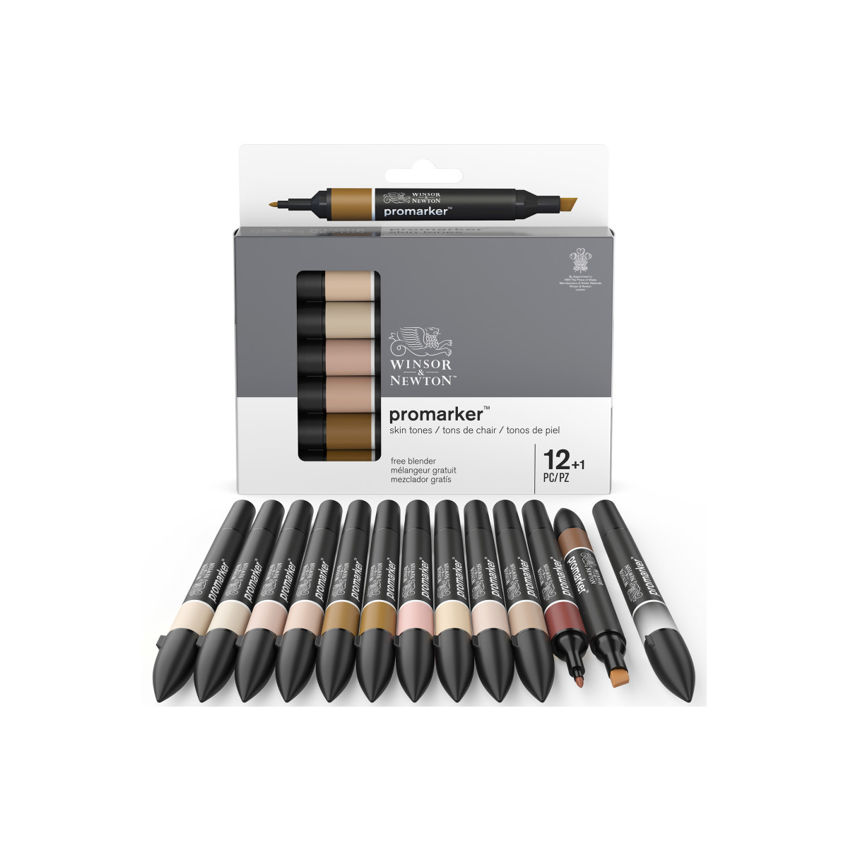 Achieve natural, blended, and beautifully nuanced complexion studies with the Winsor & Newton Promarker™ Skin Tones, Set of 12+1. This curated collection features 12 essential portrait colors, Lemon Chiffon, Misty Rose, Pale Cream, Bisque, Muted Pink, Antique White, Tan, Light Pecan, Hazelnut, Burnt Mahogany, Coffee, and Deep Mocha, plus one Blender, giving artists a complete palette for building realistic undertones, midtones, shadows, and highlights across a full range of skin types.