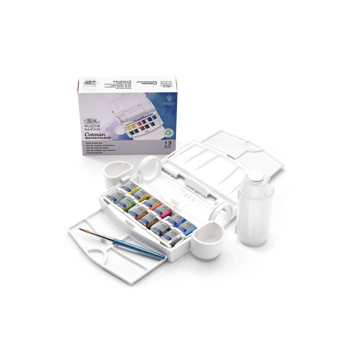The Winsor & Newton Cotman Watercolor Field Travel Set is a complete portable kit designed for outdoor painting and on-the-go creativity. Featuring 12 Cotman Watercolors made with quality, fine-art pigments, this set offers reliable transparency, vibrant washes, and excellent mixing potential. The durable case opens into a fully functional field studio, including a travel brush, a 60 mL water bottle, two clip-on water pots, and three palettes with multiple mixing areas. Ideal for plein-air painters, urban sketchers, and students, this compact kit provides everything needed for extensive color mixing and quick studies outdoors. Lightweight, packable, and thoughtfully designed, it ensures dependable performance wherever inspiration strikes.