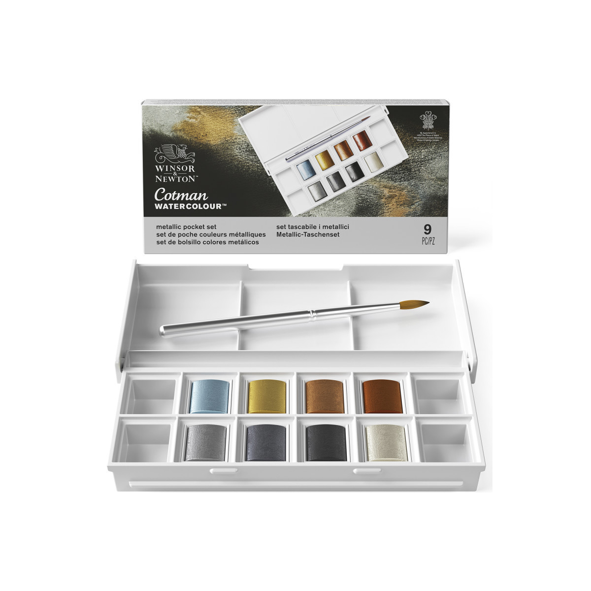 Metallic specialty palette: Includes 8 Cotman half pans in shimmering metallic and iridescent tones.