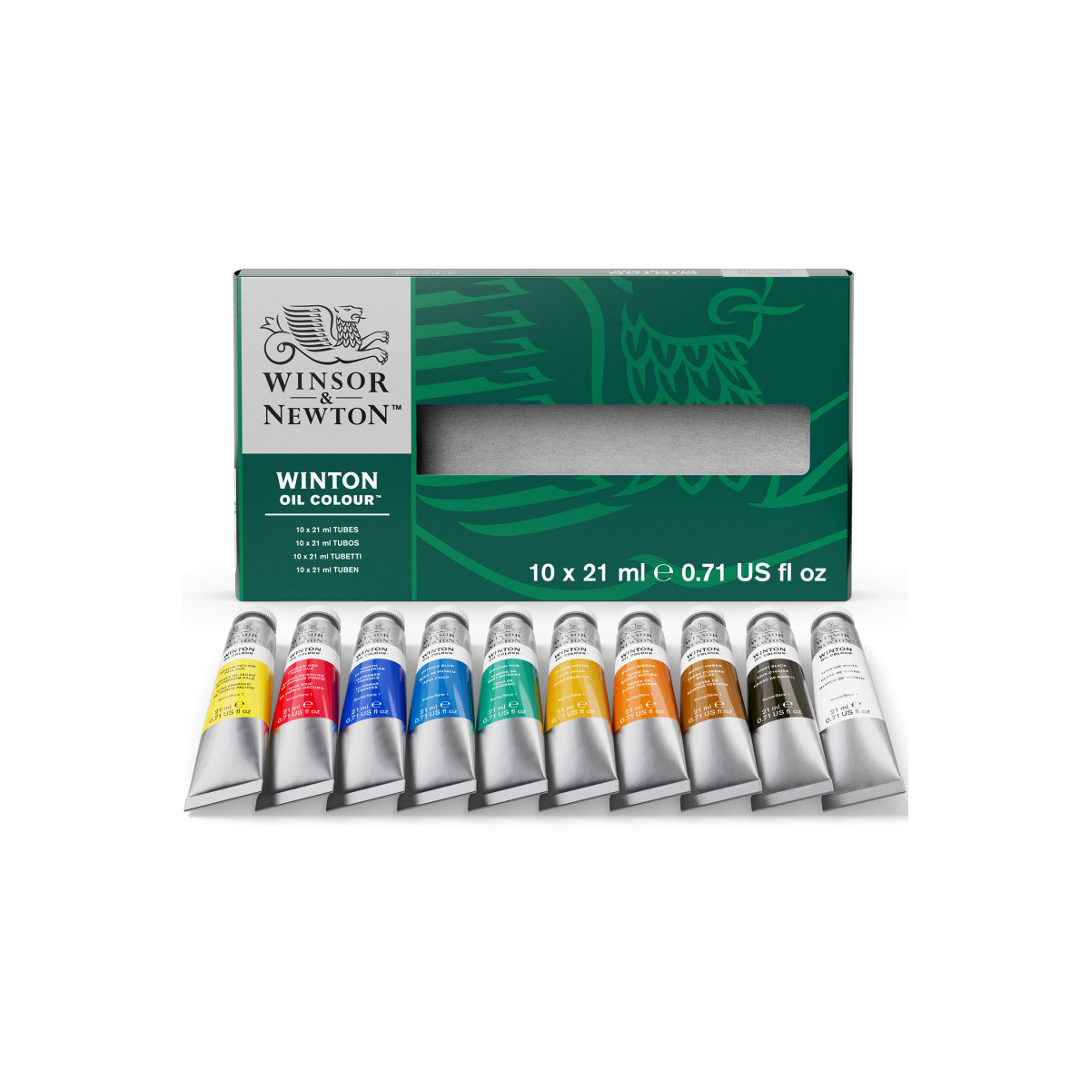 Winsor & Newton's Winton Oil Color Paint line is a bright, beautiful, and affordable range of oil paints, perfect for artists who want to experiment or need large quantities of color. All of the tones have been carefully made to bring out the best of each pigment, so you can create bold and vibrant artworks. This basic color set contains a comprehensive range of colors in 21 mL tubes. Includes: Cadmium Yellow Pale Hue, Cadmium Red Deep Hue, French Ultramarine, Phthalo Blue, Burnt Umber, Viridian Hue, Yellow Ochre, Burnt Siena, Ivory Black, and Titanium White.