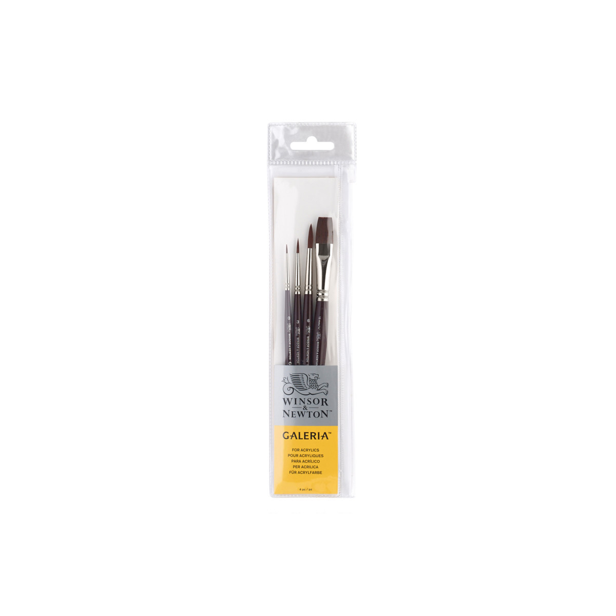 Achieve precision and dependable performance with the Galeria Acrylic Brushes, Short Handle, Set of 4 by Winsor & Newton, designed for artists seeking high-quality synthetic brushes that stand up to the thicker consistency of acrylic paints. This versatile set includes three Round brushes, Sizes 0, 3, and 6, along with a One Stroke 1/2", providing a well-rounded selection suitable for detail work, outlining, glazing, smooth coverage, and controlled strokes.