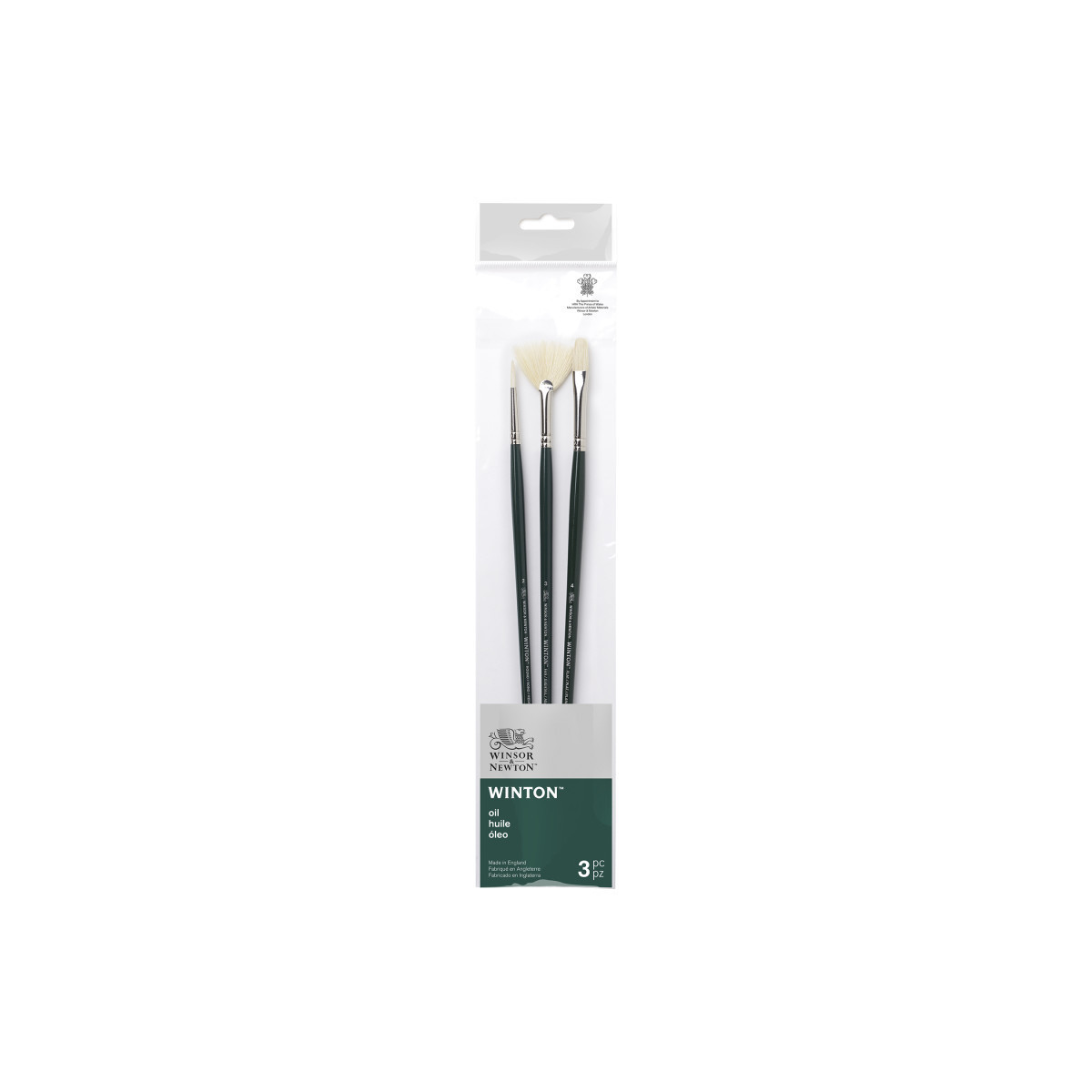 Achieve precision, texture, and smooth color application with the Winton Oil Brushes, Long Handle, Pack #3, Set of 3 by Winsor & Newton, a versatile trio created for oil painters who need durable, high-performance brushes that stand up to the dense body of oil and heavy-body acrylic paints. This pack includes a Round 2, Flat 4, and Fan 3, three complementary shapes that support detail work, clean edges, broad strokes, soft blending, and expressive textural effects.
