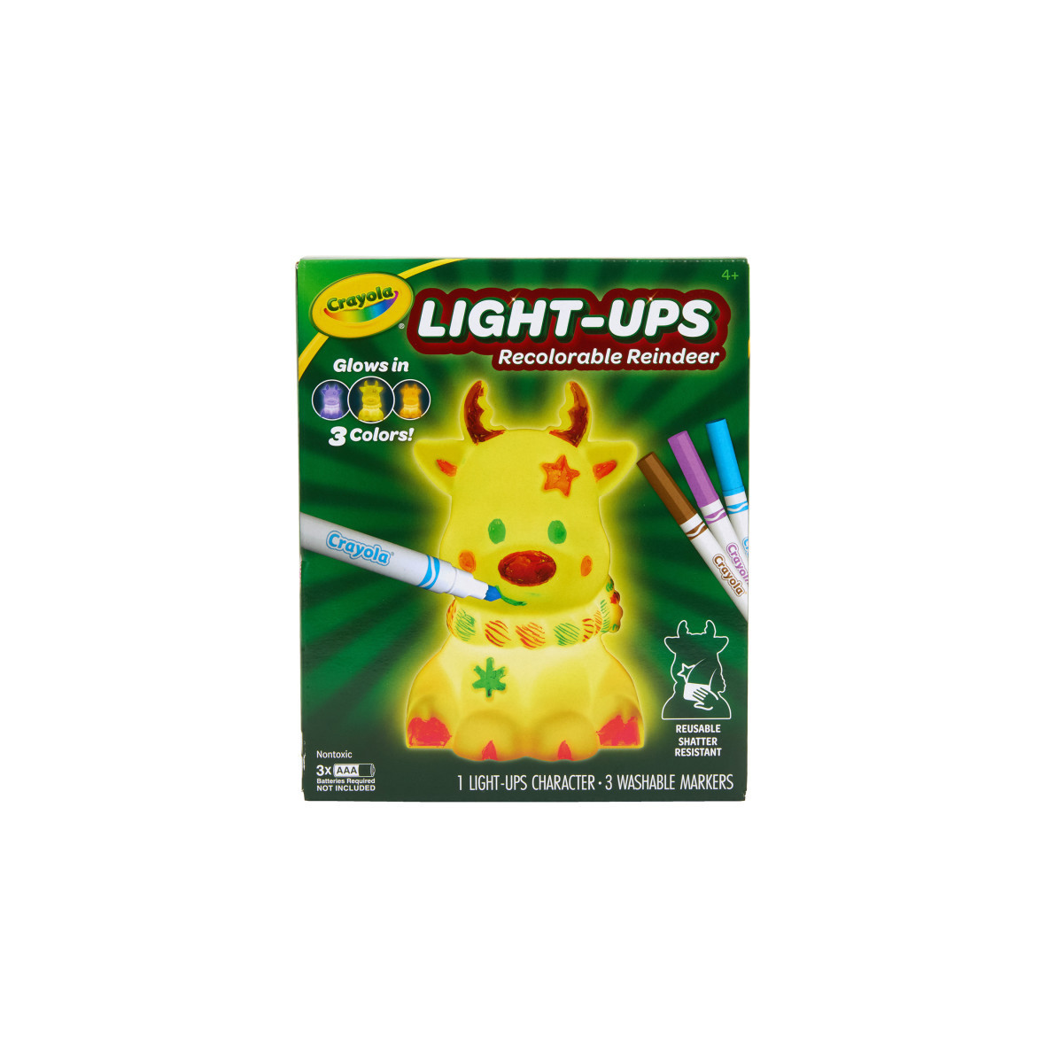 LIGHT UPS REINDEER: Features 1 Recolorable Light Ups Reindeer, 3 Mini Ultra Clean Markers (Red, Blue Bolt, Brown), and an Instruction Sheet