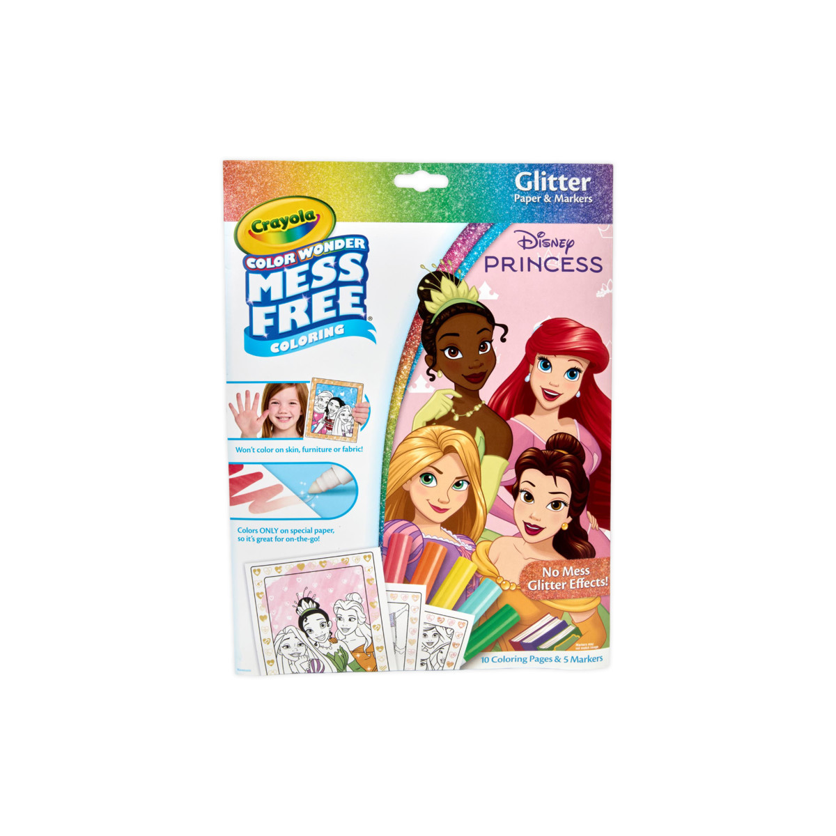Add Sparkle to Your Art with the Crayola Disney Princesses Color Wonder Glitter Set! This innovative product brings the magic of glitter without the mess, as the glitter effects are seamlessly integrated into the Color Wonder Paper. Simply use the clear Color Wonder Markers to create vibrant, shimmering masterpieces. The markers are designed to only work on Color Wonder Paper, ensuring they won't stain skin, furniture, or carpets. Folder-style packaging works as reusable storage for your coloring pages and markers. This makes it the perfect art activity for on-the-go creativity or any place where mess is a concern. The kit includes 10 glitter paper coloring pages showcasing beloved Disney Princess characters and 5 Color Wonder markers. Experience the joy of mess-free art for toddlers and let your creativity shine with Color Wonder and Disney Princesses! Safe & nontoxic, this Disney Princess coloring set makes a great gift for toddler stocking stuffers, Easter baskets, or every day gifting.