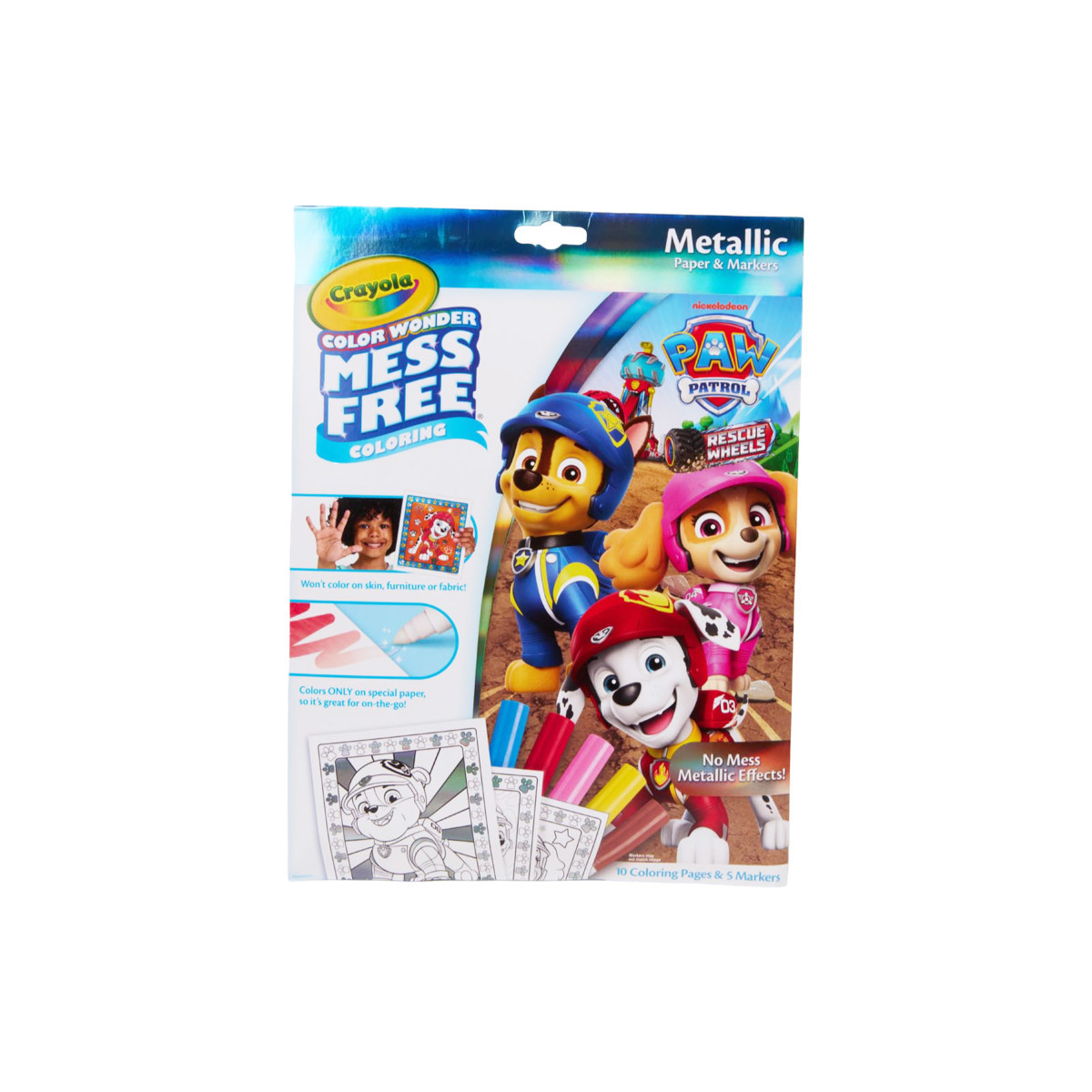 The Crayola Color Wonder PAW Patrol Metallic Box Set is the ultimate travel activity for kids that promises on the go fun! This art set offers a magical and metallic twist to mess-free coloring. With Color Wonder markers that only appear on Color Wonder paper, not on hands, clothing, or furniture, parents can let their kids color anytime, anywhere without the worry of mess. Young artists will be thrilled with these PAW Patrol Coloring Pages, featuring their favorite characters like Chase, Marshall, Rubble, and Skye. The set includes 10 Metallic Color Wonder Coloring Pages and 5 Color Wonder Markers, ensuring hours of creative fun. Folder-style packaging works as reusable storage for your coloring pages and markers, making this a great option for on the go fun. Enjoy screen free time with this PAW Patrol toy for kids. Safe and nontoxic, this coloring set makes and ideal gift for kids ages 3 and up.