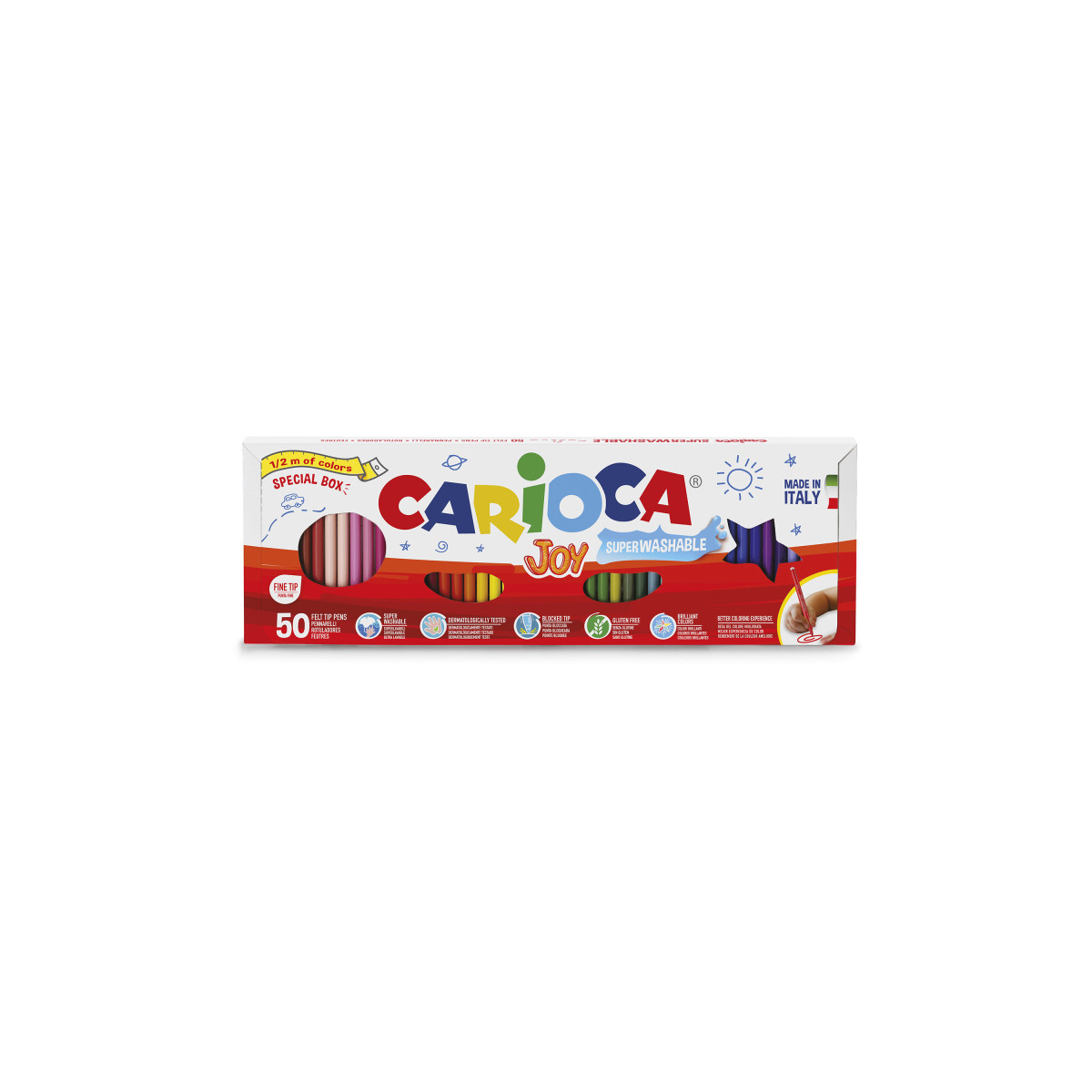 Bring a burst of color to any creative project with the Carioca Joy Fine Tip Felt Tip Pens 1/2 Meter – 50 Pieces. This impressive set offers 36 brilliant colors in a box of 50 pens, giving young artists and classrooms a rainbow of possibilities. Each marker features a fine, blocked 2.8 mm tip for precise lines and lasting performance, paired with super-washable ink that cleans easily from skin with just water. The ventilated caps ensure added safety, while the generous “1/2 meter of color” presentation delivers a fun, eye-catching display that inspires endless creativity. Proudly made in Italy for exceptional quality and reliability.