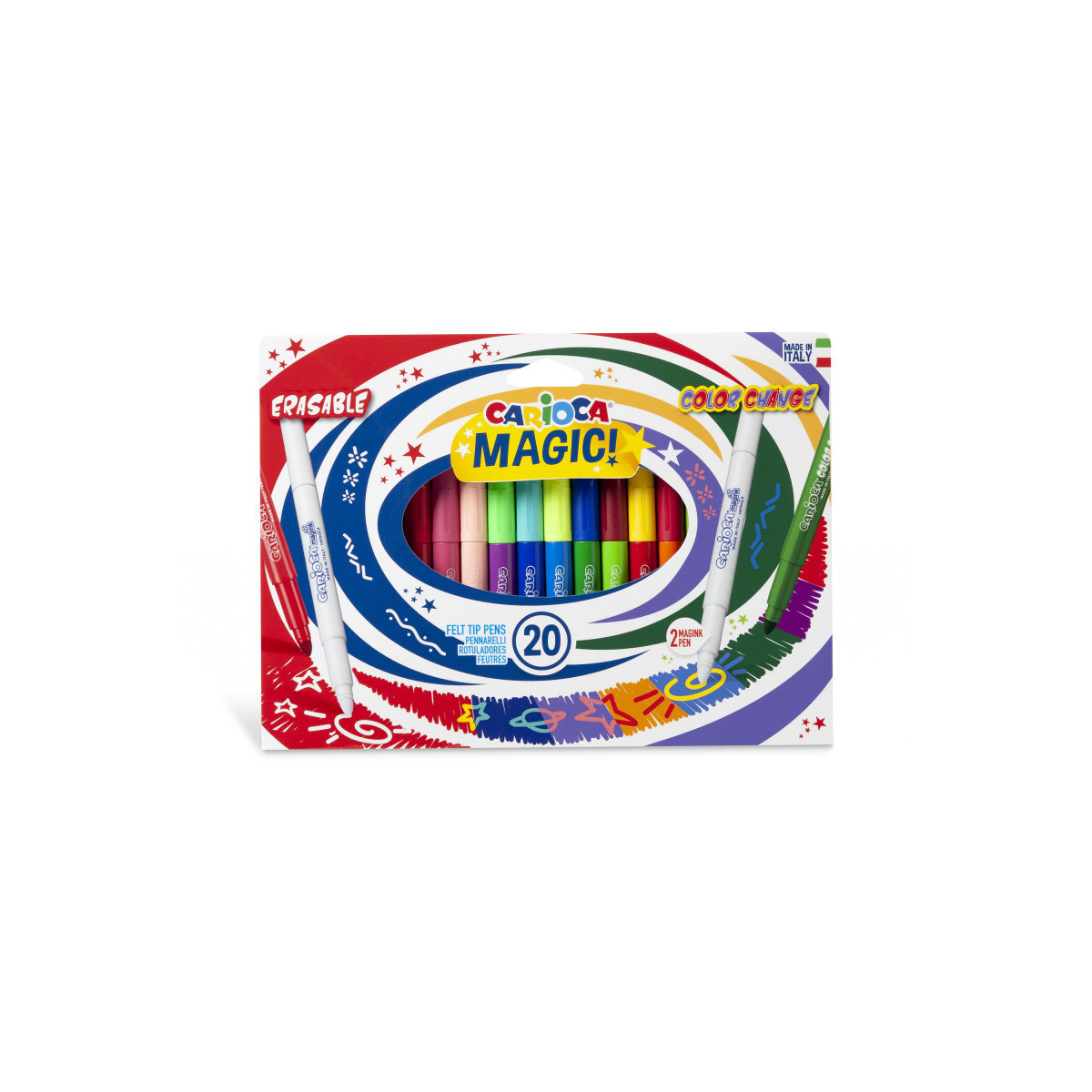The Carioca Magic Felt Tip Pens – 20 Pieces bring creativity to life with exciting color-changing and erasable effects. This unique set includes 18 magic markers (9 erasable, 9 color-changing) and 2 special Magic markers—one for changing colors and another for erasing ink. With just a swipe of the COLOR CHANGE Magink marker, kids can transform shades right before their eyes, while the ERASABLE Magink marker makes designs disappear for endless creative possibilities. Each marker features a maxi 6 mm blocked tip for bold strokes and a ventilated cap for safety. Proudly made in Italy, these magic markers combine fun, imagination, and high-quality performance.