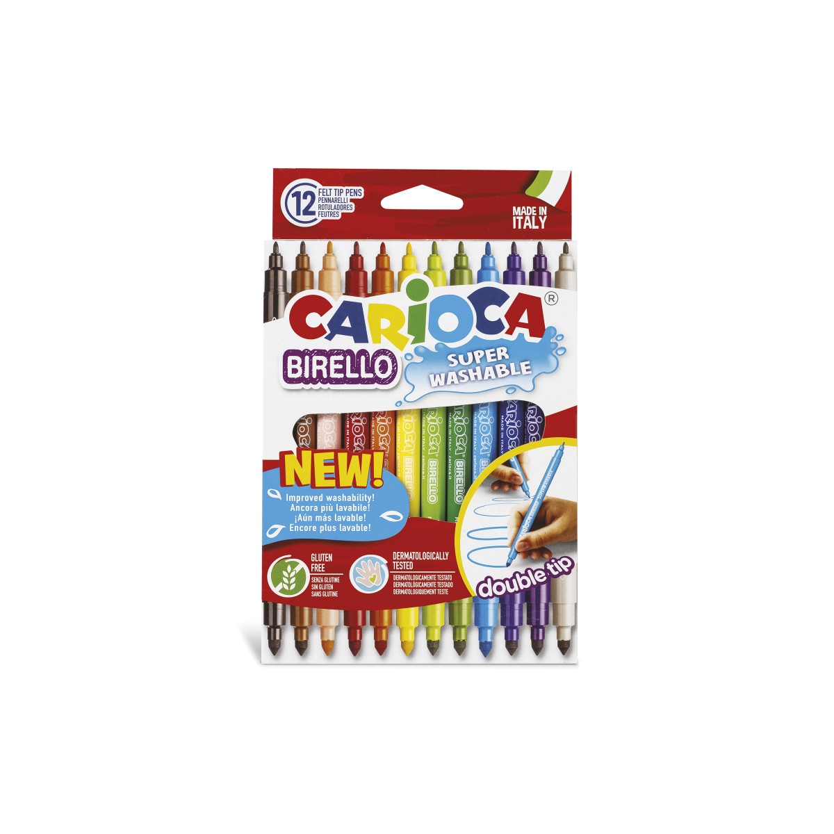 The Carioca Birello Double Tip Felt Tip Pens – 12 Pieces offer twice the creative possibilities with a fine tip on one end and a medium tip on the other. Perfect for both detailed work and bold coloring, these versatile markers are filled with nontoxic, super washable ink that can be easily cleaned from skin and most fabrics using just water. Designed for safe and enjoyable use, they are ideal for school projects, art activities, and everyday creativity. Proudly Made in Italy, this set combines quality craftsmanship with vibrant, long-lasting colors in a compact, practical box.