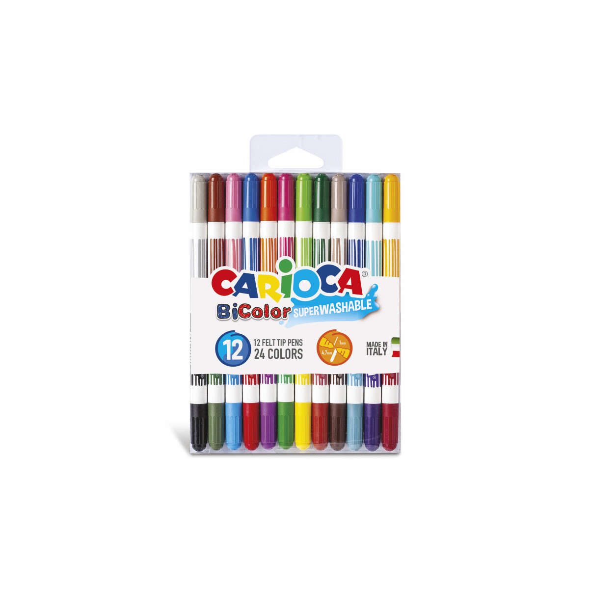 The Carioca BiColor Felt Tip Pens – 12 Pieces are a fun and innovative way to add vibrant color to any art project. Each pen features two colors in one, allowing for double strokes with a single swipe thanks to its conical tip design. Made with non-toxic, super washable ink, these markers are safe for children and easy to clean from skin and most fabrics. The set comes in a convenient blister pack of 12 BiColor pens, providing a versatile range of colors for creative expression. Made in Italy, these high-quality markers combine safety, convenience, and endless artistic possibilities for home, school, or art projects.