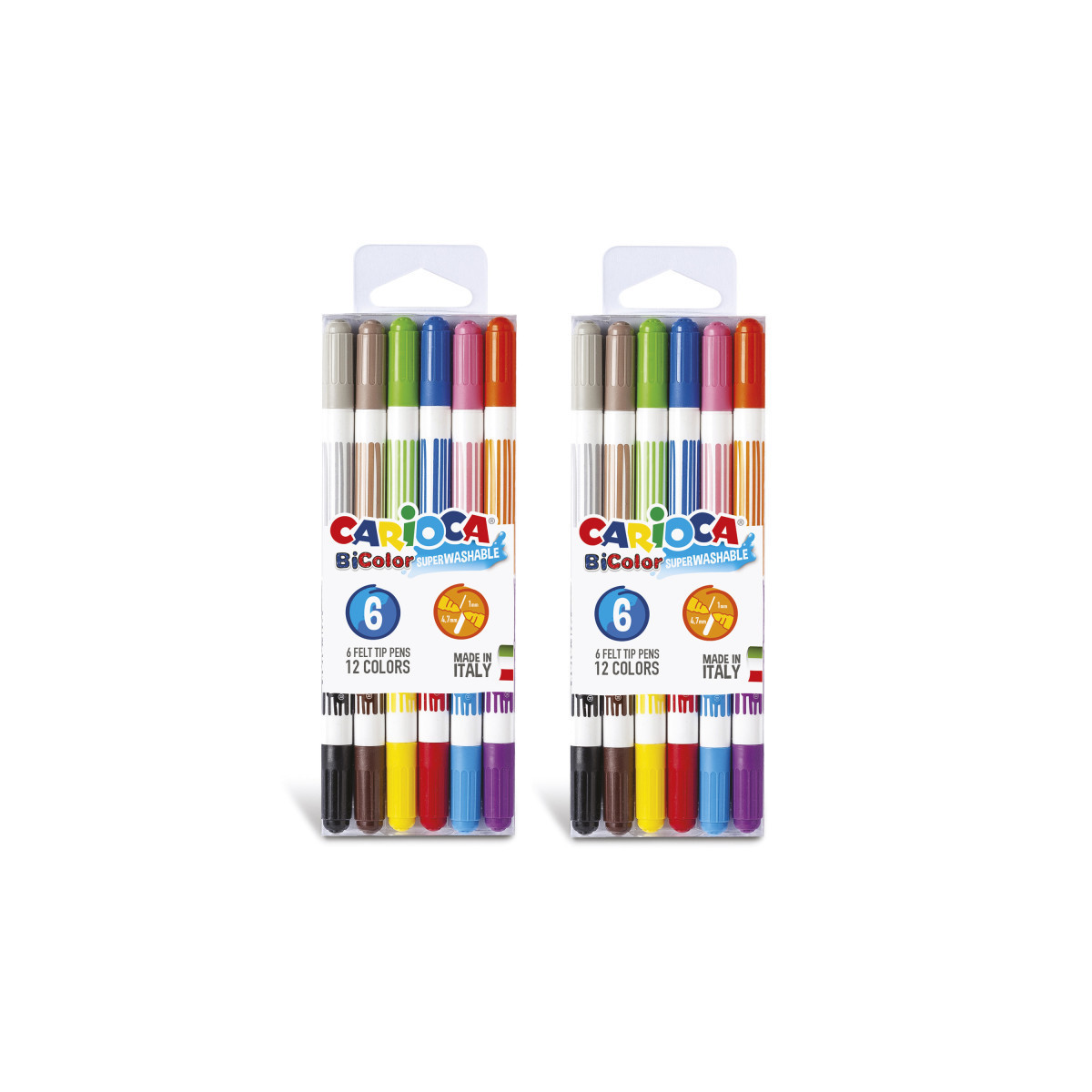 The Carioca BiColor Felt Tip Pens – 6 Pieces bring double the creativity in a single pen. Each marker features two vibrant colors in one body, making it easy to switch shades without changing pens. Designed with a conical tip for both fine lines and broad strokes, these pens are perfect for coloring, outlining, and creative lettering. The nontoxic, super washable ink ensures easy cleanup from skin and most fabrics, making them ideal for kids and adults alike. Proudly Made in Italy, this compact set offers high-quality, versatile coloring tools in a convenient blister pack. Each pack includes 6 markers. Sold as 2 packs for a total of 12 markers.