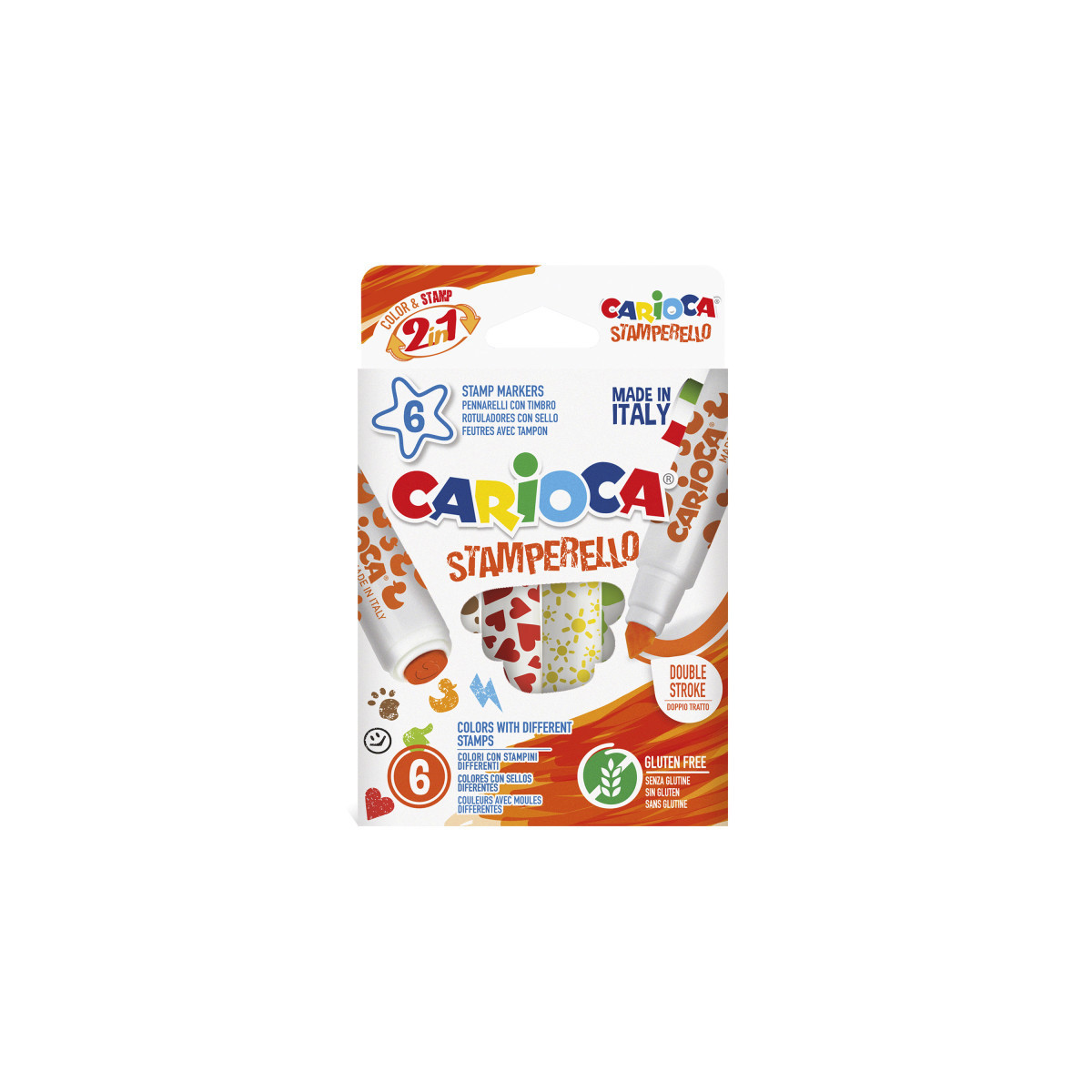 The Carioca Stamperello Felt Tip Pens Color & Stamp – 6 Pieces bring a world of creativity to kids’ art projects with their unique double-tip design. Each pen features a conical tip for precise coloring and a stamp tip for adding fun shapes and patterns. The set includes 6 vibrant colors, each with its own unique stamp mold, allowing children to combine drawing and stamping in endless ways. Made with non-toxic, washable ink, these markers are safe for kids and easy to clean from skin and most fabrics. Packaged in a convenient box, this set is perfect for home, classroom, or craft time, inspiring imagination and creative expression. Proudly made in Italy, these markers ensure quality and long-lasting performance.
