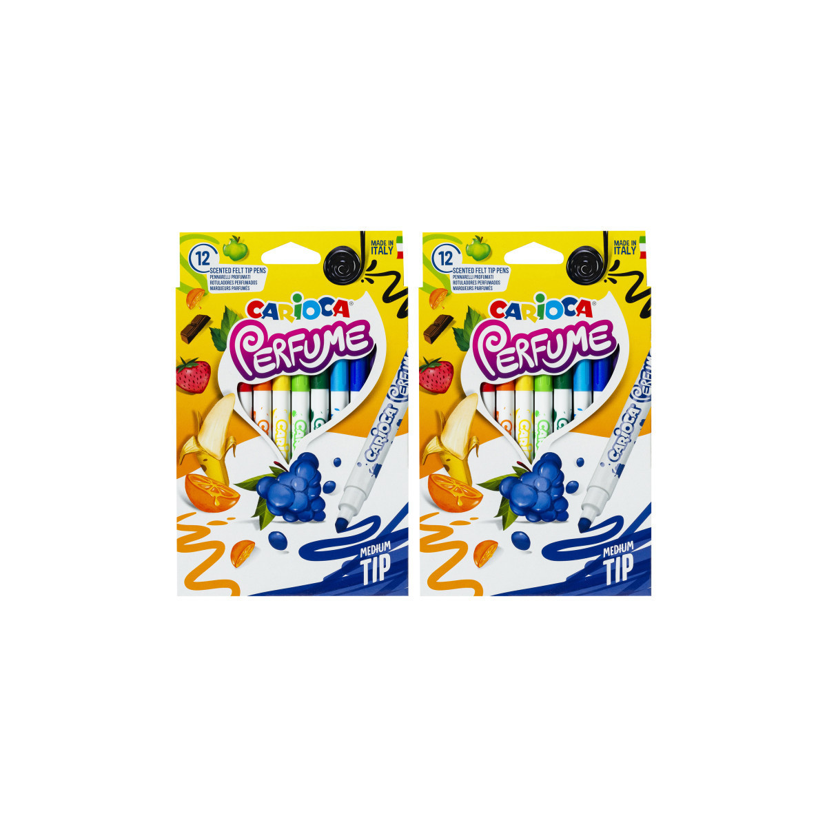 The Carioca Xplosion Perfumed Felt Tip Pens bring a delightful sensory twist to creative activities. This set of 12 scented markers is infused with aromas carefully chosen to evoke natural essences, adding an extra layer of fun to drawing and coloring. Each pen features a blocked conical tip, allowing for both fine lines and bold strokes, making them versatile for all kinds of artwork. The washable ink ensures easy cleanup, while the formula is completely free from allergenic substances, making it safe for all ages. Proudly Made in Italy, these markers combine vibrant color, quality craftsmanship, and irresistible fragrance for an unforgettable creative experience. Each pack includes 12 markers. Sold as 2 packs for a total of 24 markers.