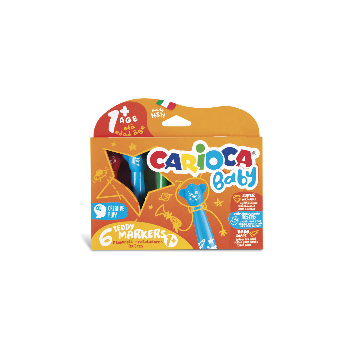 The Carioca BABY Teddy Markers – 6 Pieces are specially designed for little hands, making early creative play safe and enjoyable. Ideal for children aged 12 months and up, these ergonomic crayons are easy for toddlers to grip and control. The markers feature super washable, nontoxic ink that cleans effortlessly from skin and most fabrics with just water, no soap needed. Dermatologically tested for safety, they are perfect for introducing young children to the world of colors and imaginative storytelling. Each box contains 6 vibrant BABY Teddy Crayons, crafted in Italy to ensure quality, safety, and fun for your little artist.
