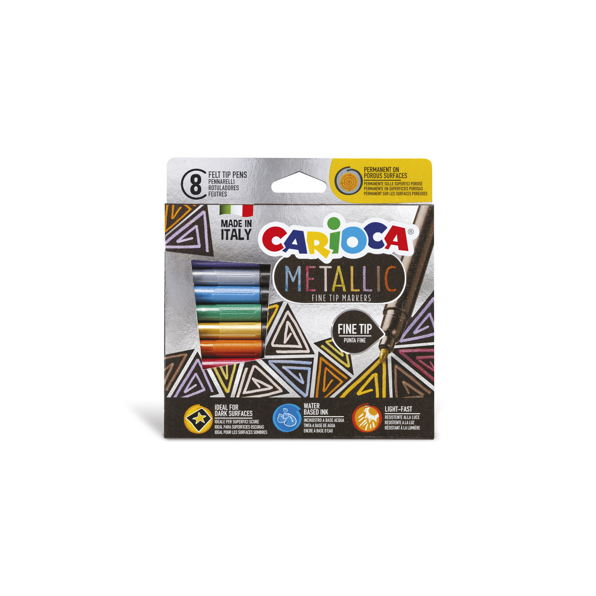 Add a shimmering touch to your projects with the Carioca Metallic Felt Tip Pens – 8 Fine Tip Markers. Designed to stand out on dark surfaces, these metallic markers offer permanent colors on porous materials and removable ink on smooth surfaces, making them perfect for customizing glassware, water bottles, and other personal items. For a lasting finish, the colors can be fixed with acrylic enamel. Each marker features water-based ink and a blocked fine tip for precision, while the bodies are made with 53% recycled plastic, combining performance with eco-conscious design. This set of 8 metallic colors is perfect for creative projects, DIY crafts, and artistic expression.