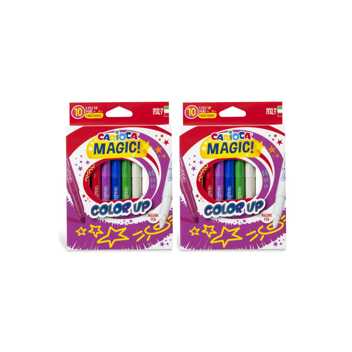 The Carioca Magic Color Up Felt Tip Pens – 10 Pieces turn ordinary coloring into an extraordinary, color-changing experience. This creative set includes 8 vibrant markers plus 2 special Magink markers in yellow and pink that can transform the other colors when layered on top. The maxi 6 mm blocked tip delivers bold, consistent strokes, while the ventilated cap ensures safety during use. Perfect for adding magical effects to any drawing, these markers inspire kids to explore and experiment with colors in new and exciting ways. Proudly Made in Italy, they combine premium quality with endless creative possibilities. Each pack includes 10 markers. Sold as 2 packs for a total of 20 markers.