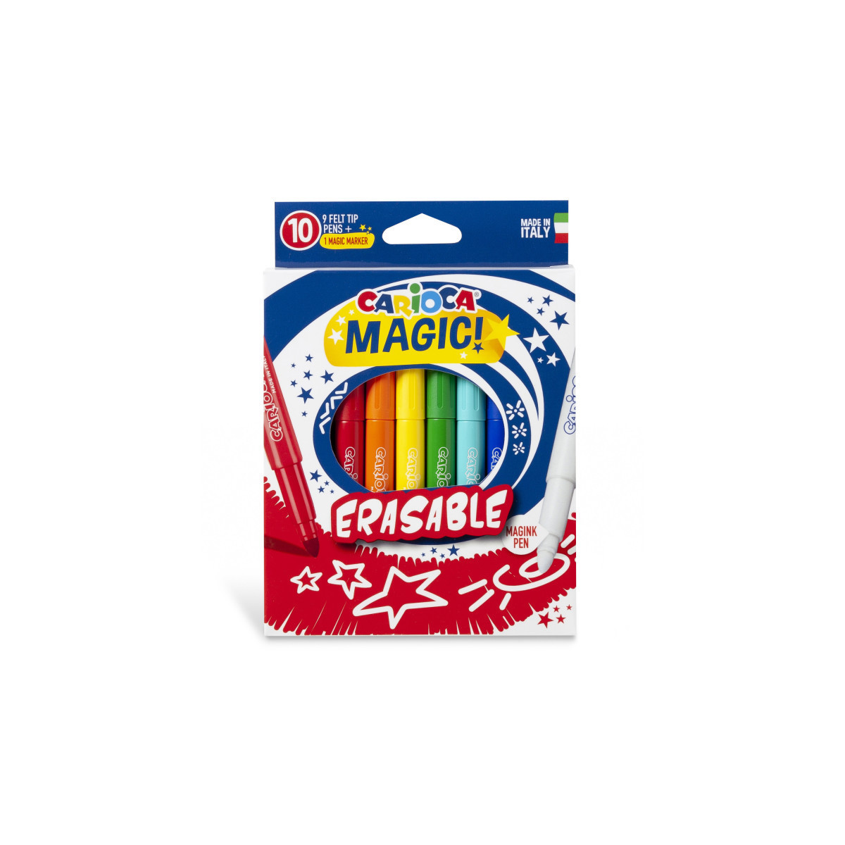 The Carioca Magic Erasable Felt Tip Pens – 10 Pieces bring an extra touch of fun to coloring time with their exciting erasable ink technology. This unique set includes 9 vibrant magic markers and 1 special Magink Erasable marker that can delete the colors instantly, allowing kids to correct mistakes or create fascinating disappearing effects. Featuring a maxi 6 mm blocked tip for bold, smooth lines and a ventilated hood for added safety, these markers are perfect for both artistic play and learning activities. Made in Italy, they combine creativity, quality, and safety for endless hours of imaginative fun.