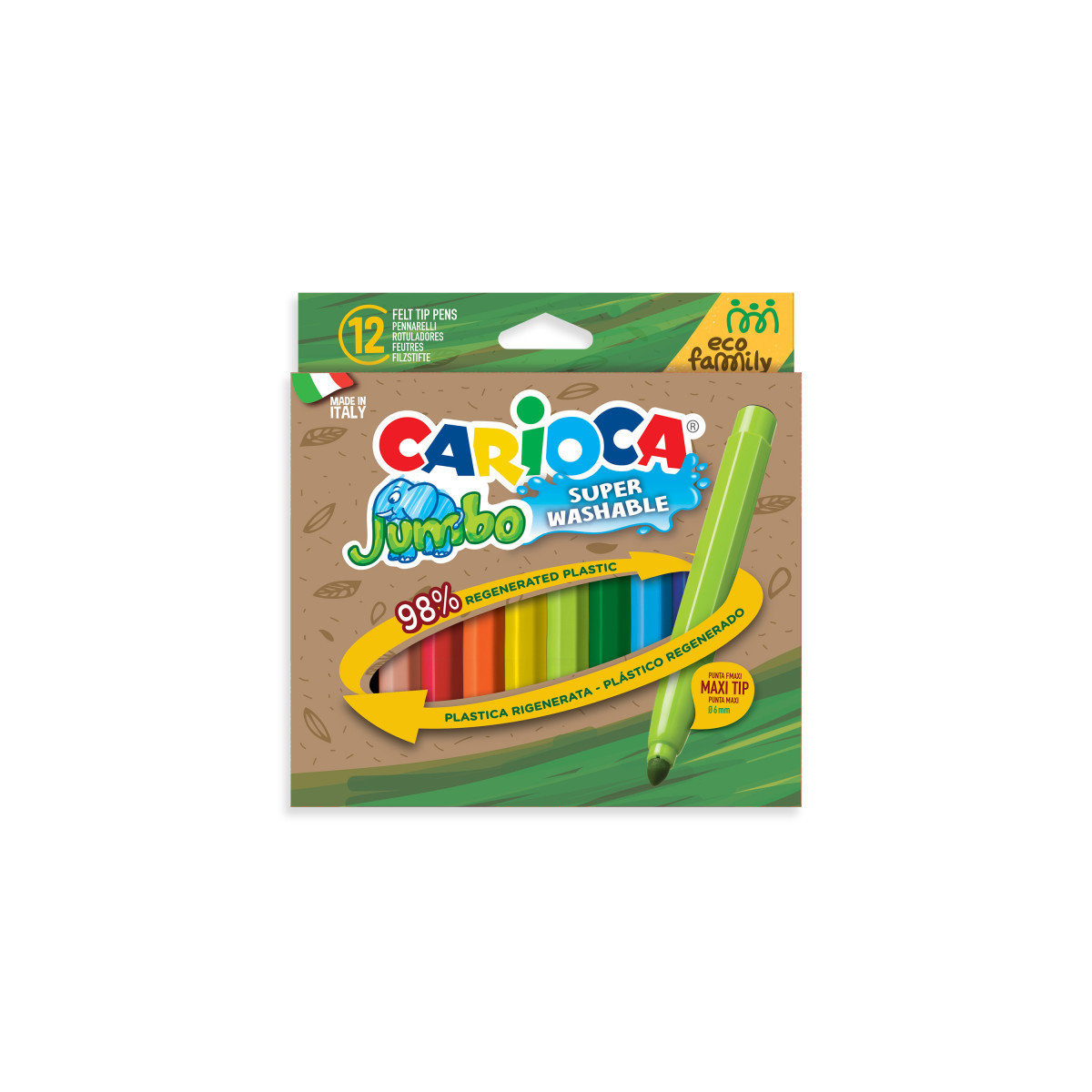 The Carioca Eco Family Jumbo Maxi Tip Felt Tip Pens – 12 Pieces are the perfect blend of creativity and sustainability. Crafted from 98% regenerated plastic, these eco-friendly markers deliver vibrant colors while helping reduce environmental impact. The super washable ink makes cleanup easy from skin and most fabrics, while the maxi 6 mm blocked tip ensures durability and bold strokes. A ventilated cap provides added safety, making them ideal for classrooms, home projects, and creative activities. Proudly made in Italy, these markers are a responsible choice for artists of all ages.