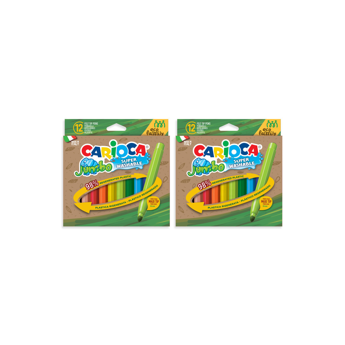 The Carioca Eco Family Jumbo Maxi Tip Felt Tip Pens – 12 Pieces are the perfect blend of creativity and sustainability. Crafted from 98% regenerated plastic, these eco-friendly markers deliver vibrant colors while helping reduce environmental impact. The super washable ink makes cleanup easy from skin and most fabrics, while the maxi 6 mm blocked tip ensures durability and bold strokes. A ventilated cap provides added safety, making them ideal for classrooms, home projects, and creative activities. Proudly made in Italy, these markers are a responsible choice for artists of all ages. Each pack includes 12 markers. Sold as 2 packs for a total of 24 markers.