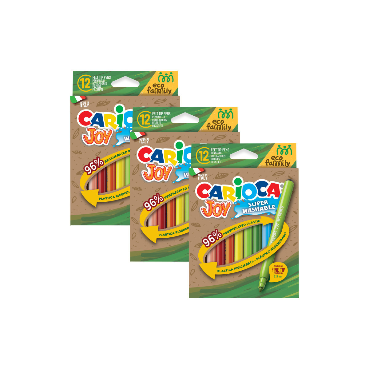 The Carioca Eco Family Joy Fine Tip Felt Tip Pens – 12 Pieces combine eco-conscious design with vibrant, precise coloring. Made from 98% regenerated plastic, these markers are an environmentally friendly choice for artists of all ages. The fine 2.8 mm blocked tip is perfect for detailed work while remaining durable for long-lasting use. With super washable ink, cleanup from skin and most fabrics is quick and easy, and the ventilated cap adds an extra layer of safety. Proudly made in Italy, these markers deliver quality, precision, and sustainability in every stroke. Each pack includes 12 markers. Sold as 3 packs for a total of 36 markers.