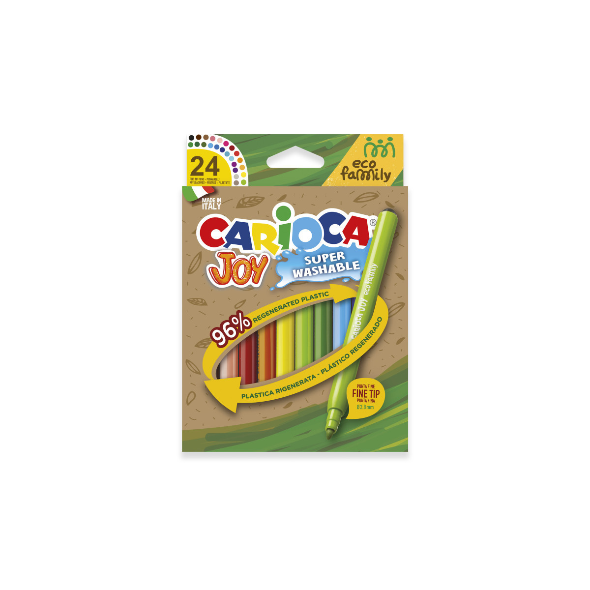 The Carioca Eco Family Joy Fine Tip Felt Tip Pens – 24 Pieces combine eco-conscious design with vibrant, precise coloring. Made from 98% regenerated plastic, these markers are an environmentally friendly choice for artists of all ages. The fine 2.8 mm blocked tip is perfect for detailed work while remaining durable for long-lasting use. With super washable ink, cleanup from skin and most fabrics is quick and easy, and the ventilated cap adds an extra layer of safety. Proudly made in Italy, these markers deliver quality, precision, and sustainability in every stroke.