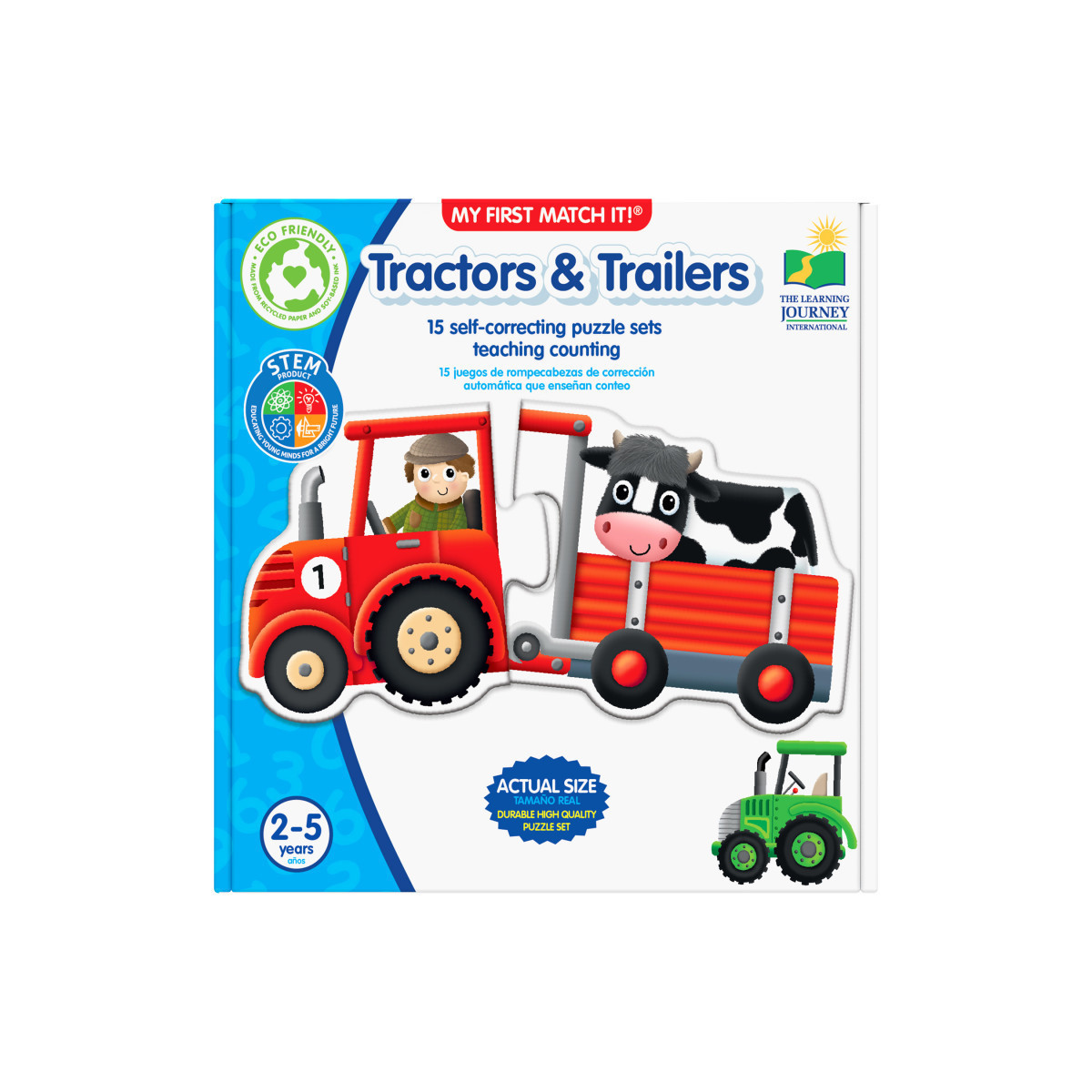 Matching is an important pre-reading skill that children need to develop in order to help them get ready for school. My First Match It! Tractors & Trailers is the perfect tool to help your little ones practice this essential skill. This set contains two piece self-correcting puzzle cards that introduce colors and counting recognition skills. The fun, brightly illustrated cards are designed for a younger child and engage them in the learning process in an entertaining way. My First Match It! - Tractors & Trailers includes 15 self- correcting puzzle pairs. Ages 2+ years
