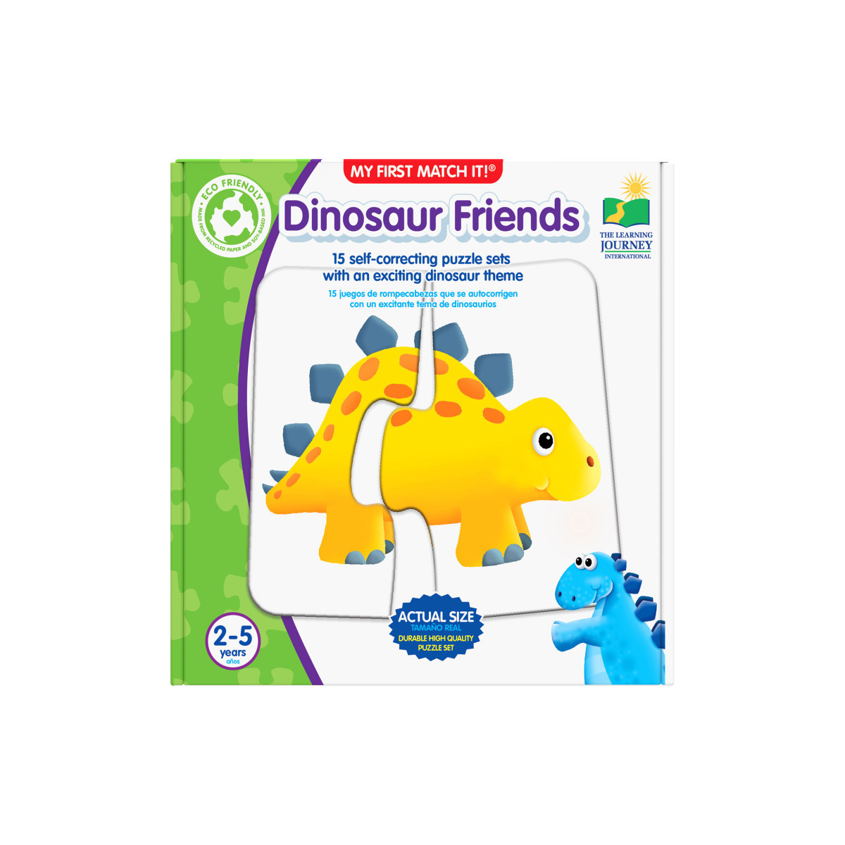 Matching is an important pre-reading skill that children need to develop in order to help them get ready for school. My First Match It! Dinosaur Friends is the perfect tool to help your little ones practice this essential skill. This set contains two piece self-correcting puzzle cards that introduce familiar topics. The fun, brightly illustrated cards are designed for a younger child and engage them in the learning process in an entertaining way. My First Match It!- Dinosaur Friends includes 15 self- correcting puzzle pairs. Ages 2+ years