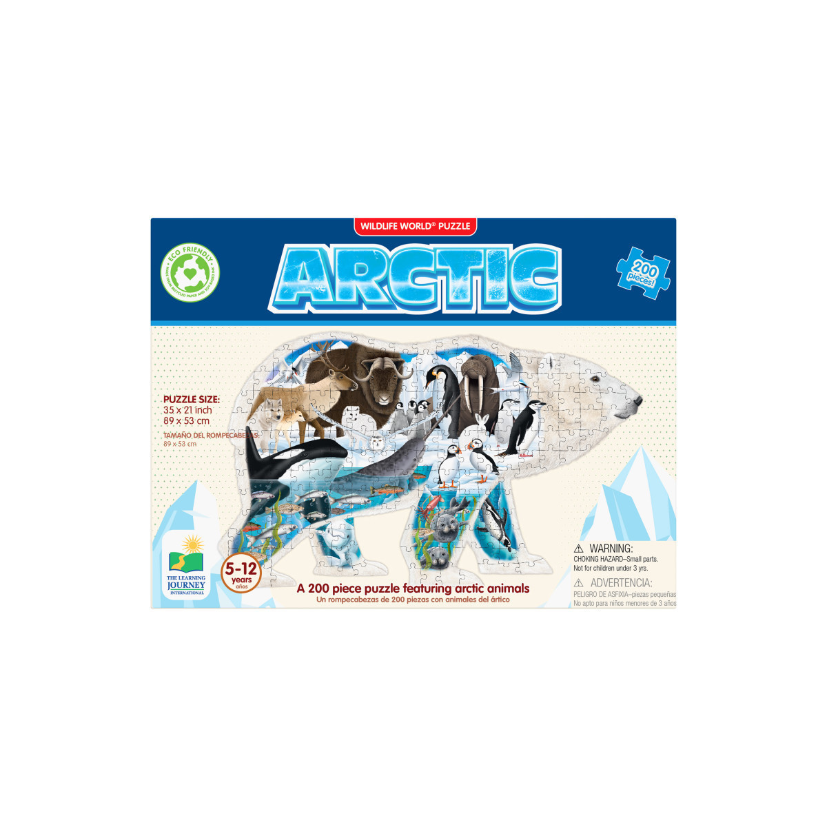 The Wildlife World Puzzle Series by The Learning Journey takes learning about Wildlife to a new level. This unique puzzle, both in shape and content, will have kids learning about natural habitats and more. This 200 piece Arctic puzzle is shaped as a Polar Bear and introduces the environment of the Arctic. This 200-piece puzzle will help develop problem solving skills, spike interest, and expand knowledge of different environments. The colors and patterns of the polar bear are beautiful and fascinating! The puzzle measures approximately 3' x 2'! Eco Friendly design is made from 70% recycled paper. Ages 5-12 years.