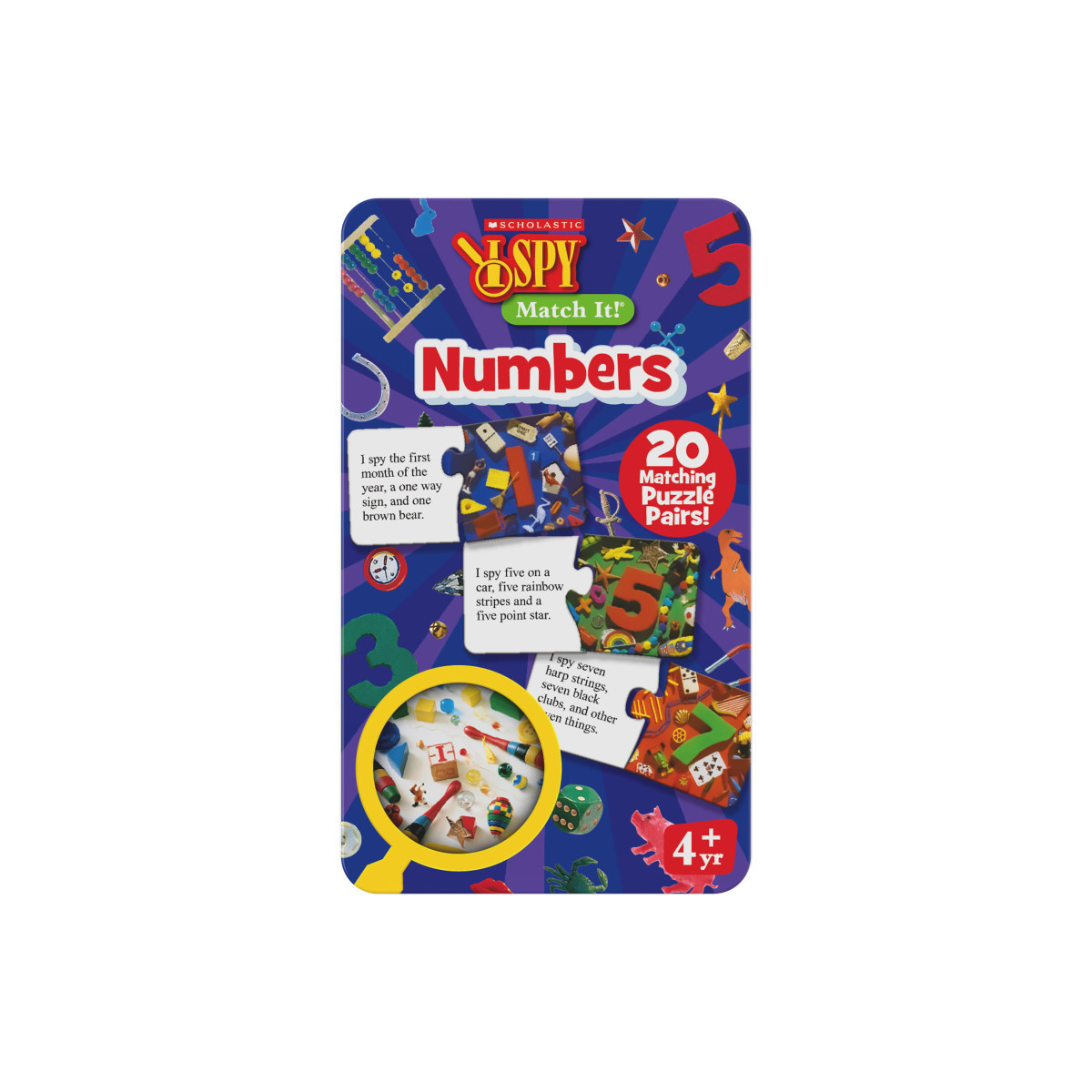 Let's learn about numbers from 1 to 20 with I Spy Match It! Numbers! Each puzzle card has two pieces: the numeral and objects reflecting that number or the same number of objects to count. Look around and "spy" for the objects that match the number and by simply matching the pieces together, children will learn to recognize the numeral and develop their counting skills. The puzzles are self-correcting and include 20 puzzle sets. Recommended for ages 3+ years.