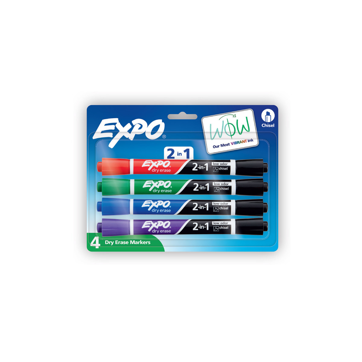 Double the color with dual-ended Expo® Dry Erase 2-in-1 Markers. Featuring a different vibrant color at each end, Expo dry erase markers make it easy to deliver exciting presentations, boldly emphasize ideas and keep calendars organized. Expo white board markers use vivid, low-odor ink and have a versatile chisel tip that marks three line widths. From the classroom to the boardroom, Expo 2-in-1 dry erase markers add excitement to every situation.
