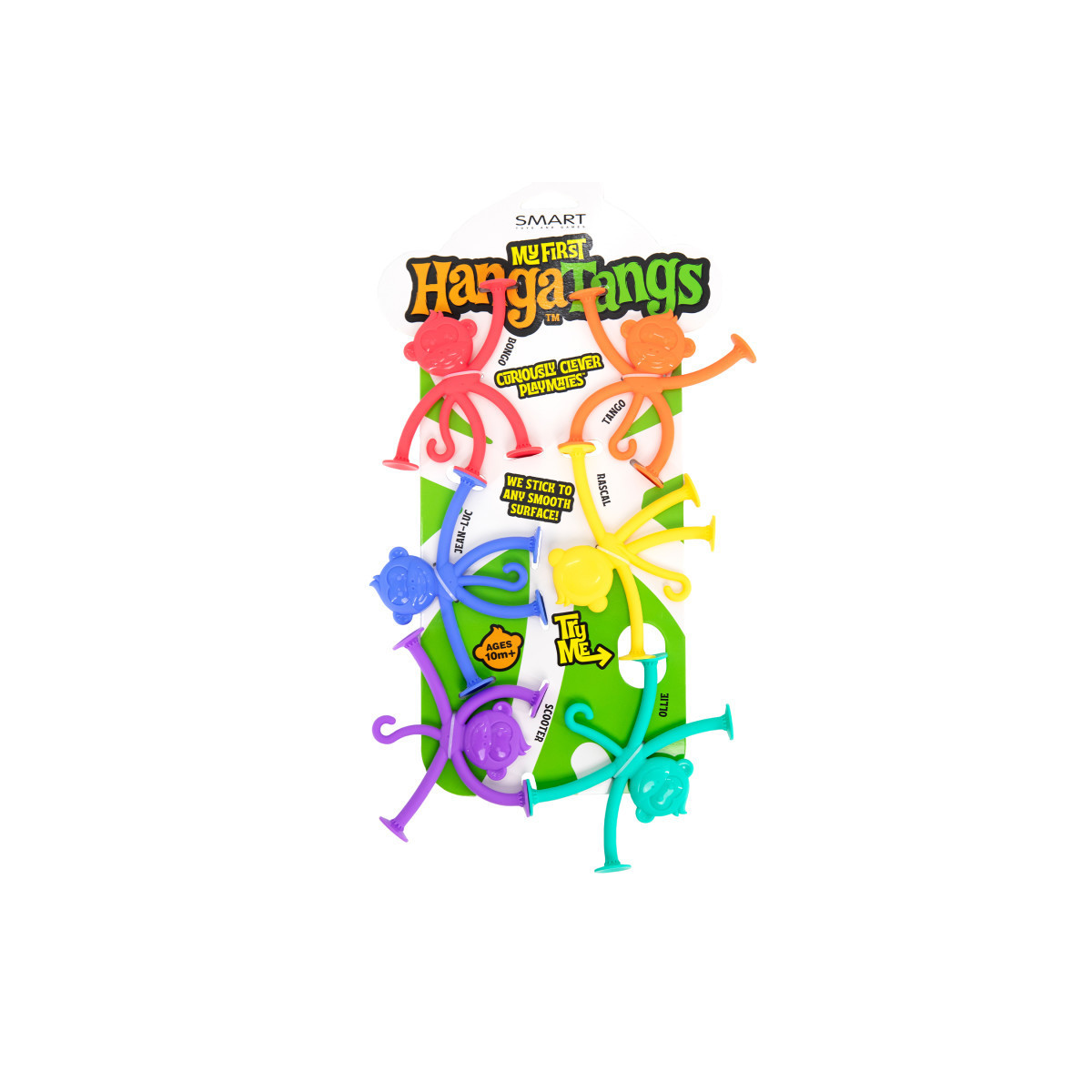 My First Hangatangs stick to and hang from any non-porous surface, are easy to clean, and are dishwasher safe.