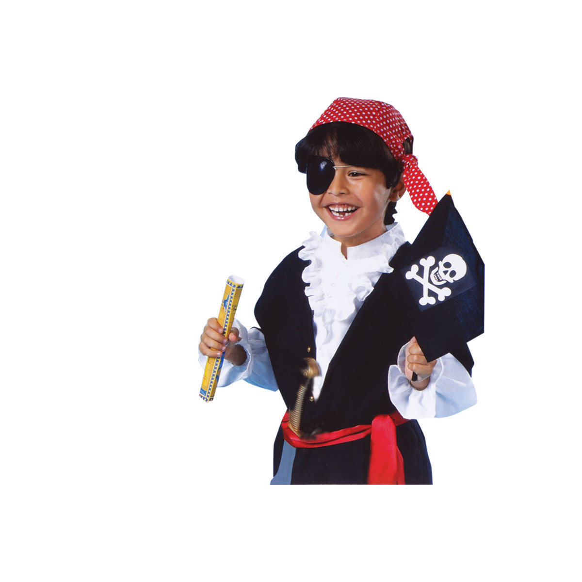 - Complete Pirate Set – Includes coat, pants, turban, treasure map, belt, pirate flag, eye patch, and pretend dagger.