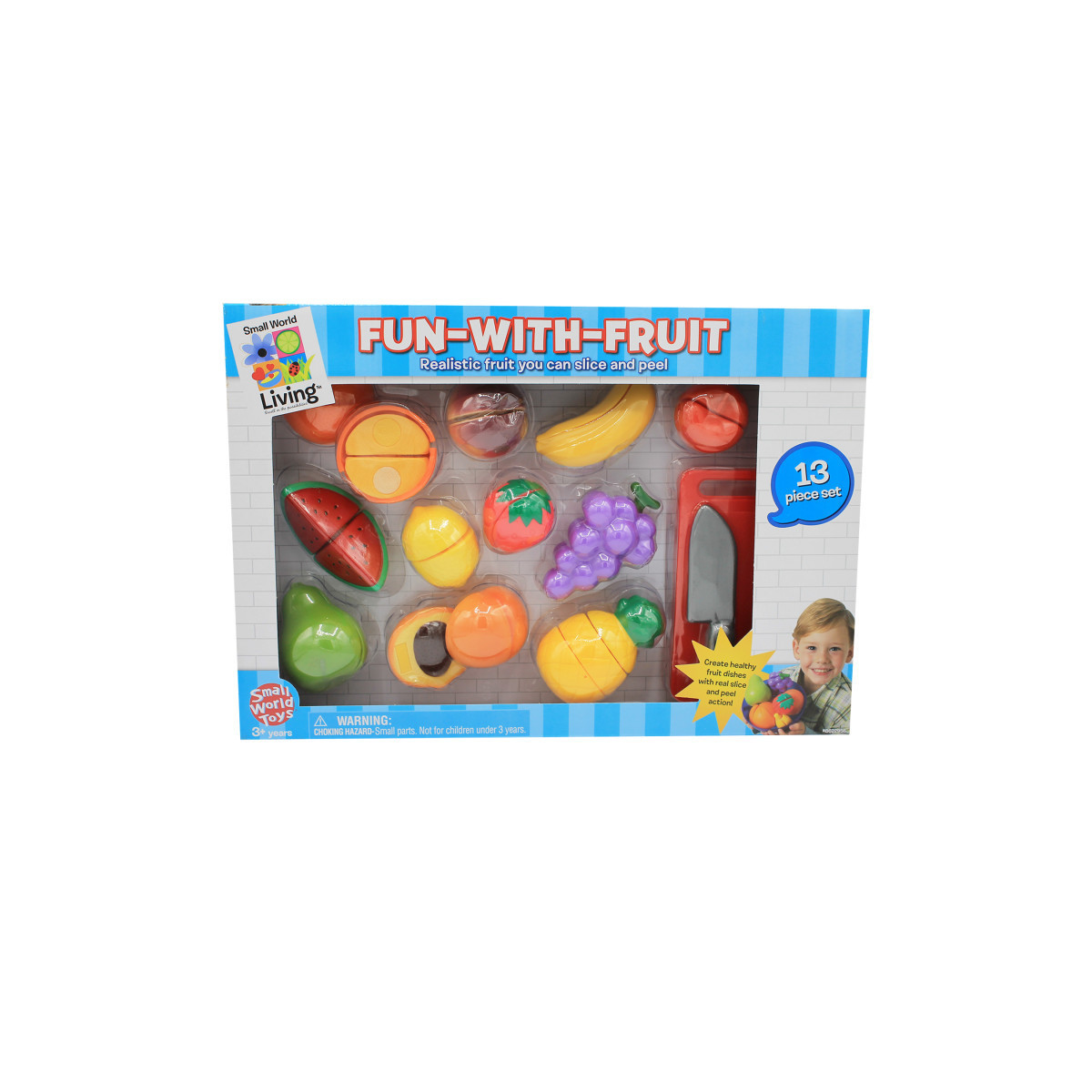13-Piece Fruit Set – Includes apple, strawberry, grapes, orange, watermelon, peach, pineapple, pear, plum, lemon, banana, cutting board, and plastic knife.
