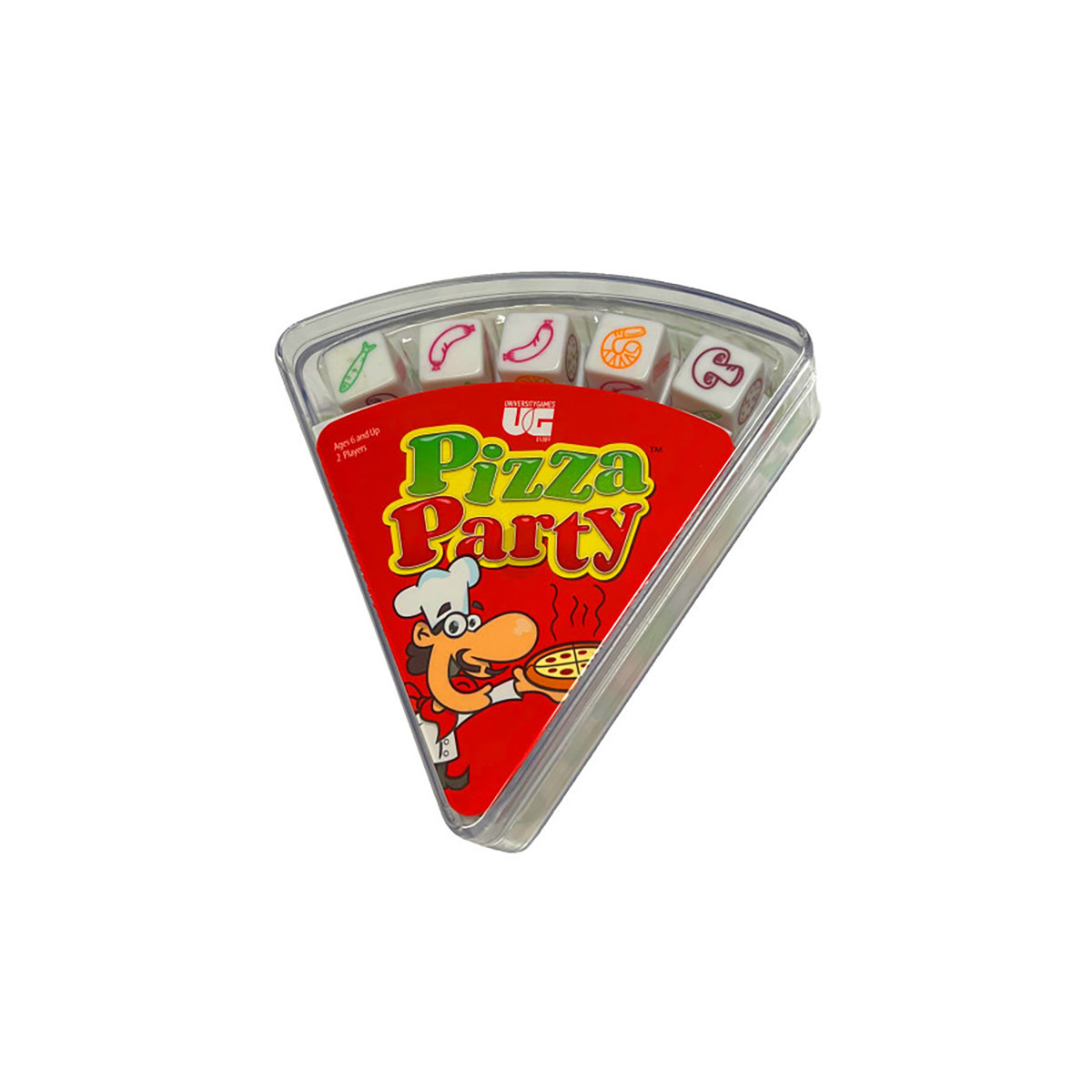 A fast and frantic dice game for two! Roll your dice to match the toppings on your slice. Keep rolling until they all match. Now grab another card and keep going! The first player to create a whole pizza pie wins! For 2 players, ages 6 and up. Add more players by adding additional copies of the game. Contents: 10 Pizza Toppings Dice, 40 Pizza Slice Cards, Rules.