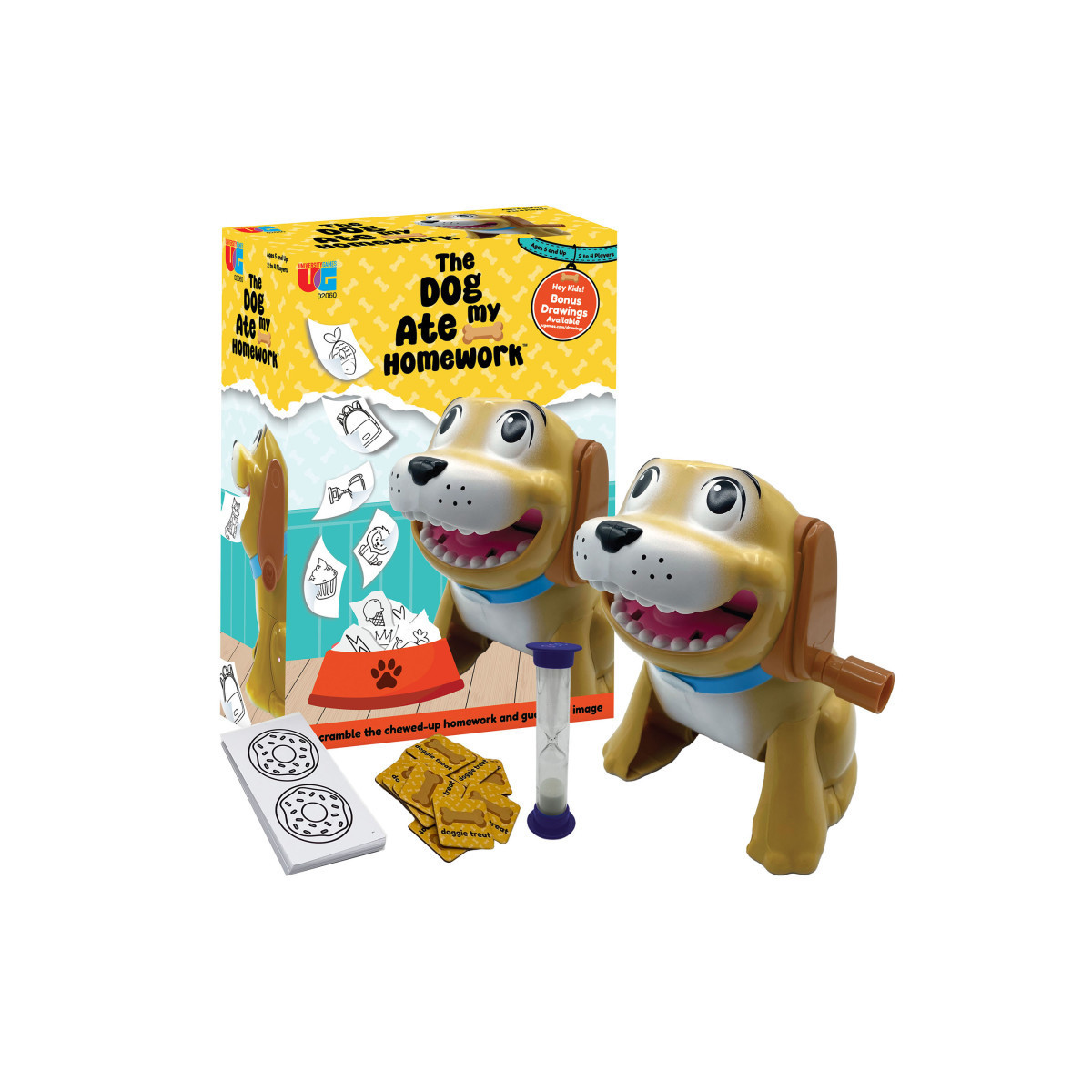 Pick a Homework Sheet, put it in the Dog's mouth, turn his ear, then collect the shreds out of his rear end. Unscramble the shredded Homework and correctly guess the image. Turn it in before the deadline to win! Every correct guess wins a Doggie Treat. The player with the most Doggie Treats after three rounds wins the game! This game is perfect for family gatherings and game nights, offering endless laughter and entertainment for kids and adults alike. The innovative doggie mechanism safely shreds Homework Sheets into 16 strips and mixes them up as they exit the Dog’s rear end. Simple rules and fast-paced gameplay make The Dog Ate My Homework ideal for children aged 5 and up. Players feed the Homework into the dog’s mouth, turn his ear, and retrieve the shreds out of the dog’s rear end. Players have 30 seconds to assemble the picture and guess the image. The player with the most Doggie Treats after three rounds wins the game! For 2-4 players, ages 5 and up.