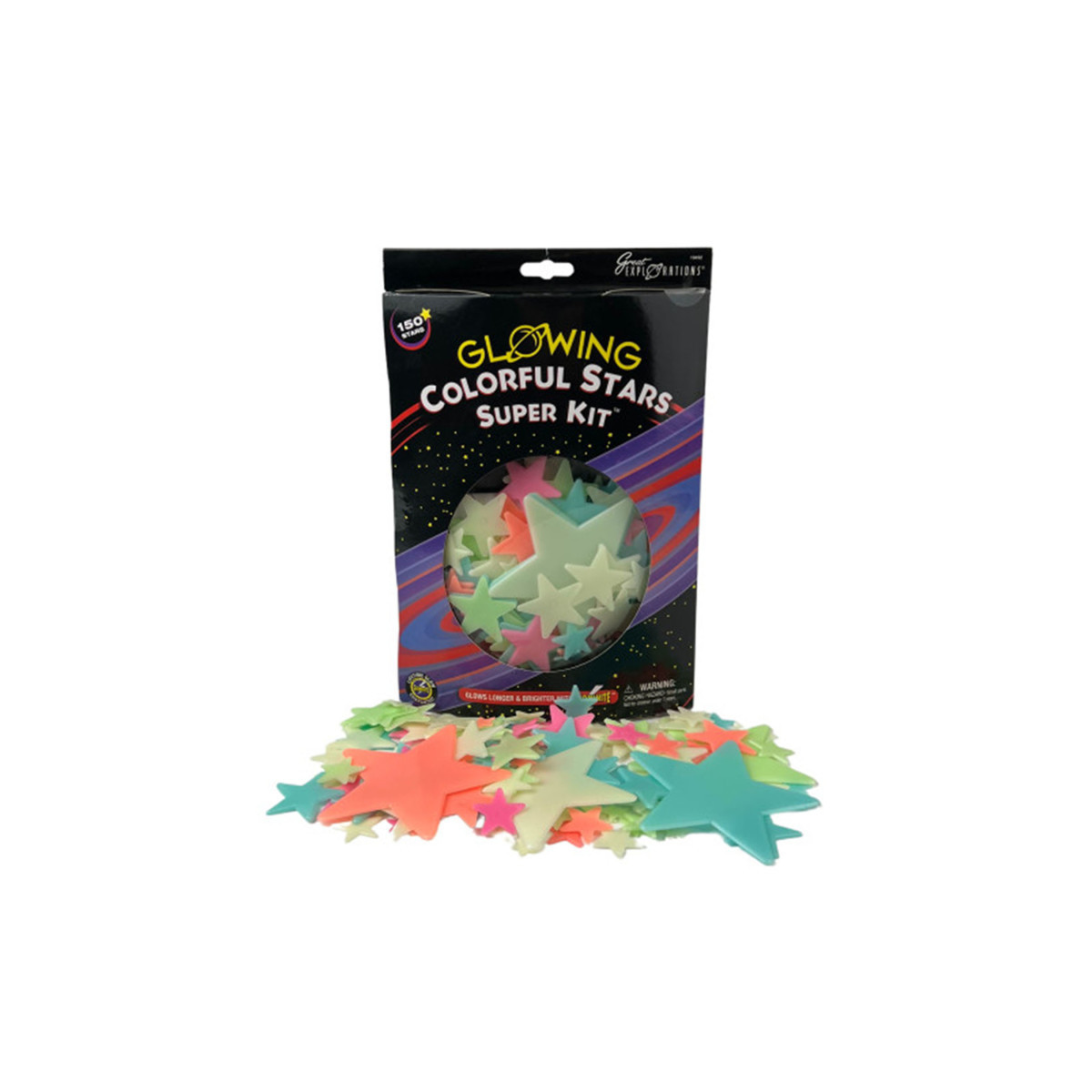Light up your night with the Colorful Stars Super Kit from Great Explorations. This glow in the dark kit includes 150 stars and adhesive putty you can use to stick the stars to your walls and ceiling. Then turn off your lights and float through outer space as you drift off to sleep. Great Explorations stars out-glow all others, thanks to our proprietary Glominite formula. This fun galaxy of stars comes with a Star chart, so you can create classic constellations. Great Explorations products encourage kids to imagine and create as they explore the world around them. Great Explorations has been the glow-in-the-dark leader for over a decade, helping children discover the wonders of planets, stars and outer space. Our products are the highest quality. Great Explorations is all about fun and the joy of learning. Transform your ceiling into a starry sky! This kit comes with 150 stars in a galaxy of sizes and safe, re-useable adhesive putty. A star chart is included, so you can create classic constellations or make your own astronomical arrangements. Whatever twinkles your star! A special phosphorescent formula gives these glow-in-the-dark stars a life that's almost as long as the real thing: they're rechargeable so they won't wear out. Just expose them to light and they're ready to glisten once more.