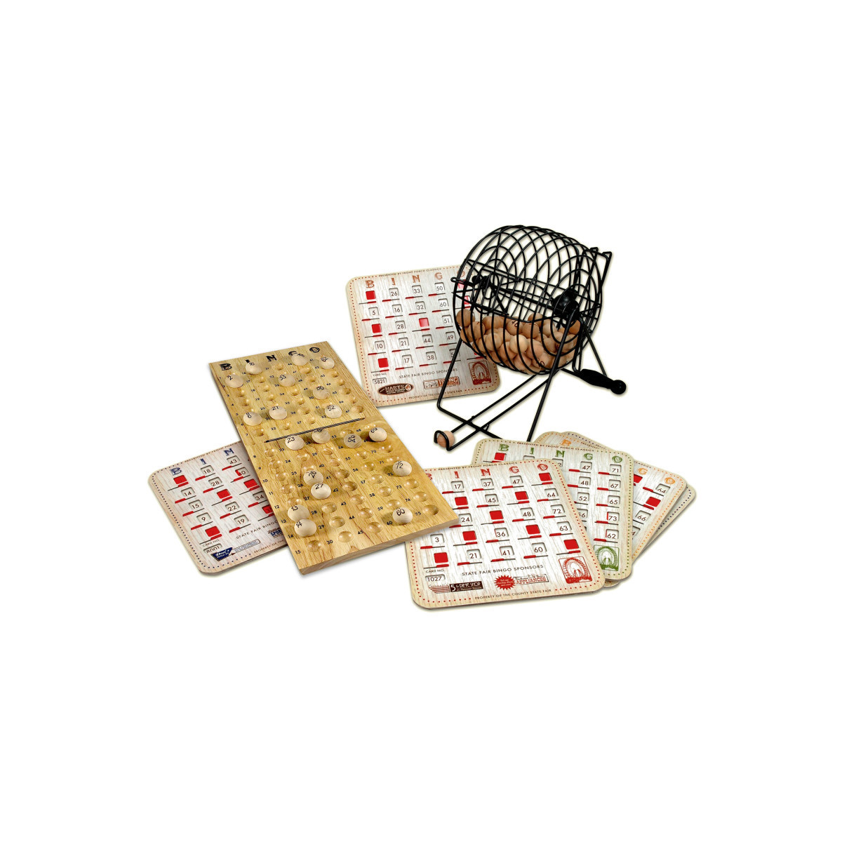 Bingo has come a long way since the early 1930s when numbered discs were pulled from a cigar box and players marked their cards with beans. This high-quality Bingo set features a classic metal ball-spinner, wooden Bingo balls, a solid wood bingo board and nostalgic shutter Bingo cards. Whether you are playing for fun or for prizes, State Fair Bingo is sure to provide hours of edge-of-your-seat entertainment. For 2-8 players, ages 8 and up. Contents: 1 Traditional Spinner Cage, 77 Wooden Bingo Balls, 1 Wooden Marker Board , 8 Classic Shutter Sheets, 1 Cotton Bag, and Instructions.