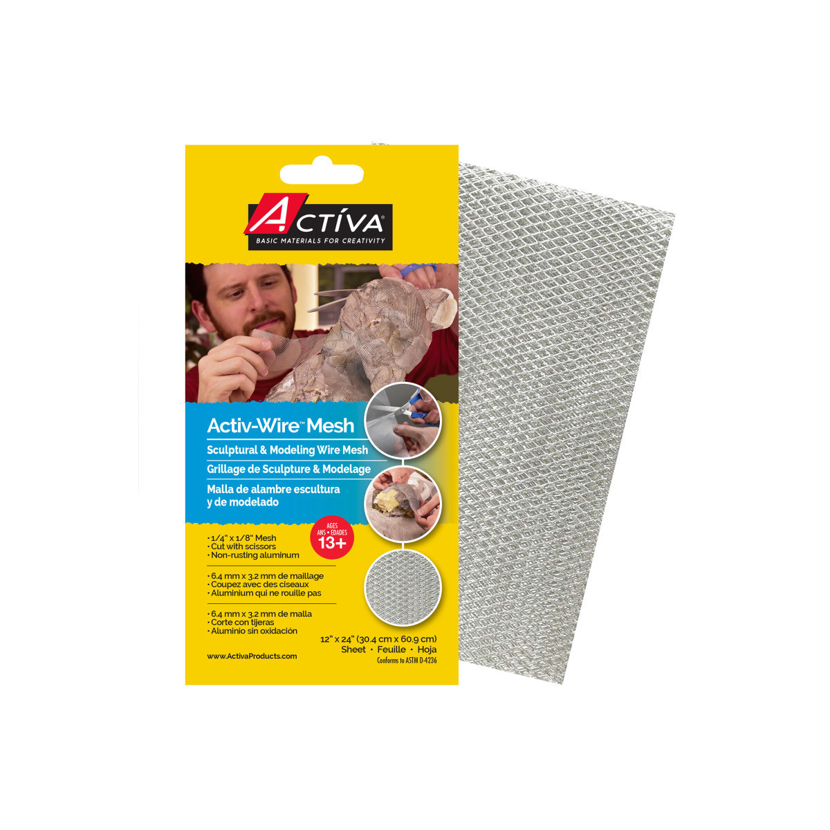 The Sculptural & Modeling Activ-Wire Mesh™, 12x24 in Sheet, Large Weave (1/4x1/8 in) is a versatile, easy-to-shape aluminum mesh designed for building durable internal structures and expressive three-dimensional forms. Strong yet highly flexible, this mesh cuts cleanly with scissors and bends smoothly into curves, angles, or organic shapes without breaking. The large 1/4 x 1/8 in weave provides excellent support while allowing plaster, paper mâché, clay, and other sculpting materials to grip securely during application. Lightweight and rustproof, Activ-Wire Mesh™ is ideal for use in classrooms, studios, theater prop construction, costume design, fine art sculpture, and craft projects. Once covered or coated, the mesh retains its form, making it a reliable foundation for both permanent and temporary sculptural work.