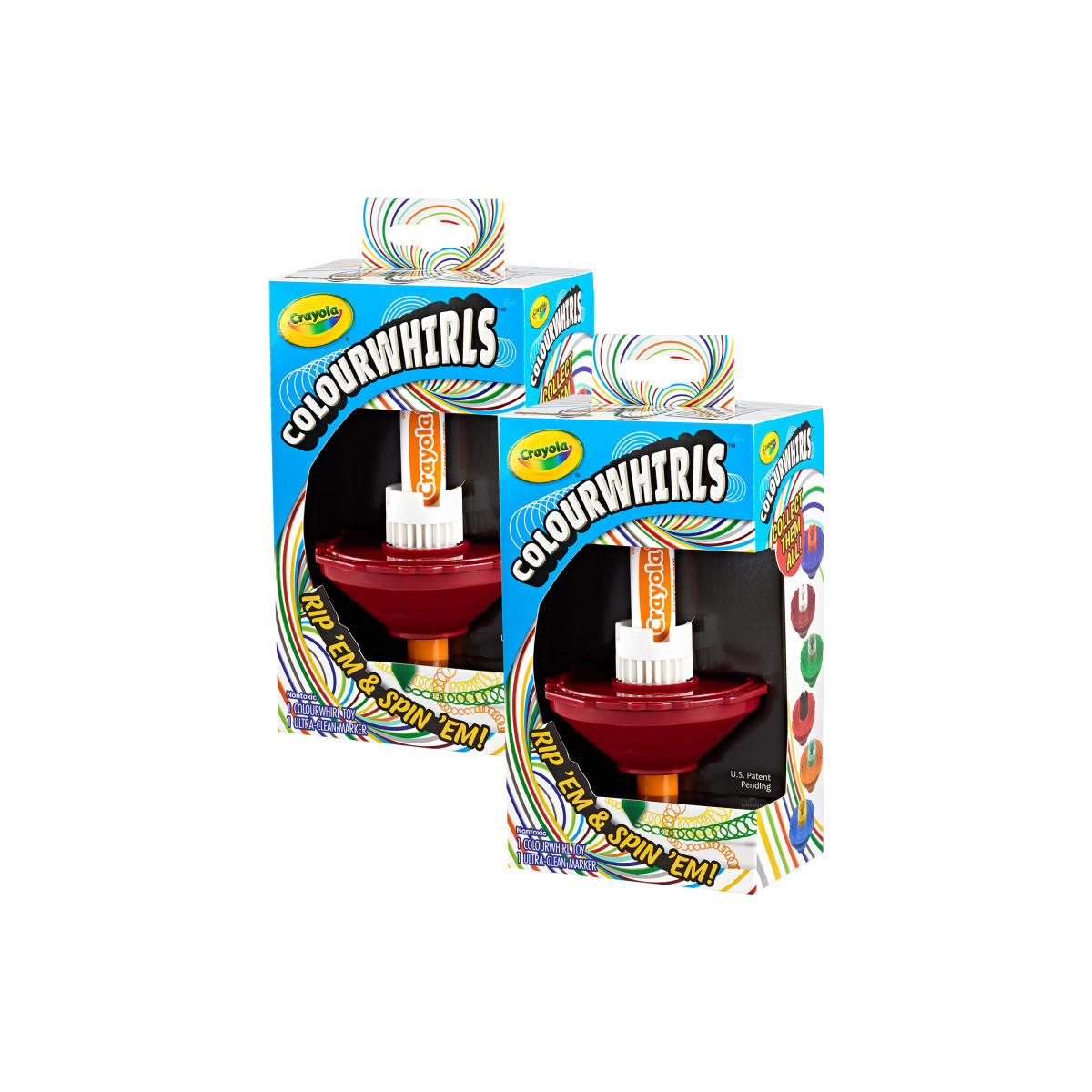 CRAYOLA COLOURWHIRLS: Compete in a whirlwind battle of creativity with 2 Colourwhirls sets, each set includes 1 Spinner, 1 Handle, 1 Rip Cord, 1 Adaptor, 1 Marker Holder, 1 Re-Colorable Disc, and 1 Crayola Ultra Clean Marker.