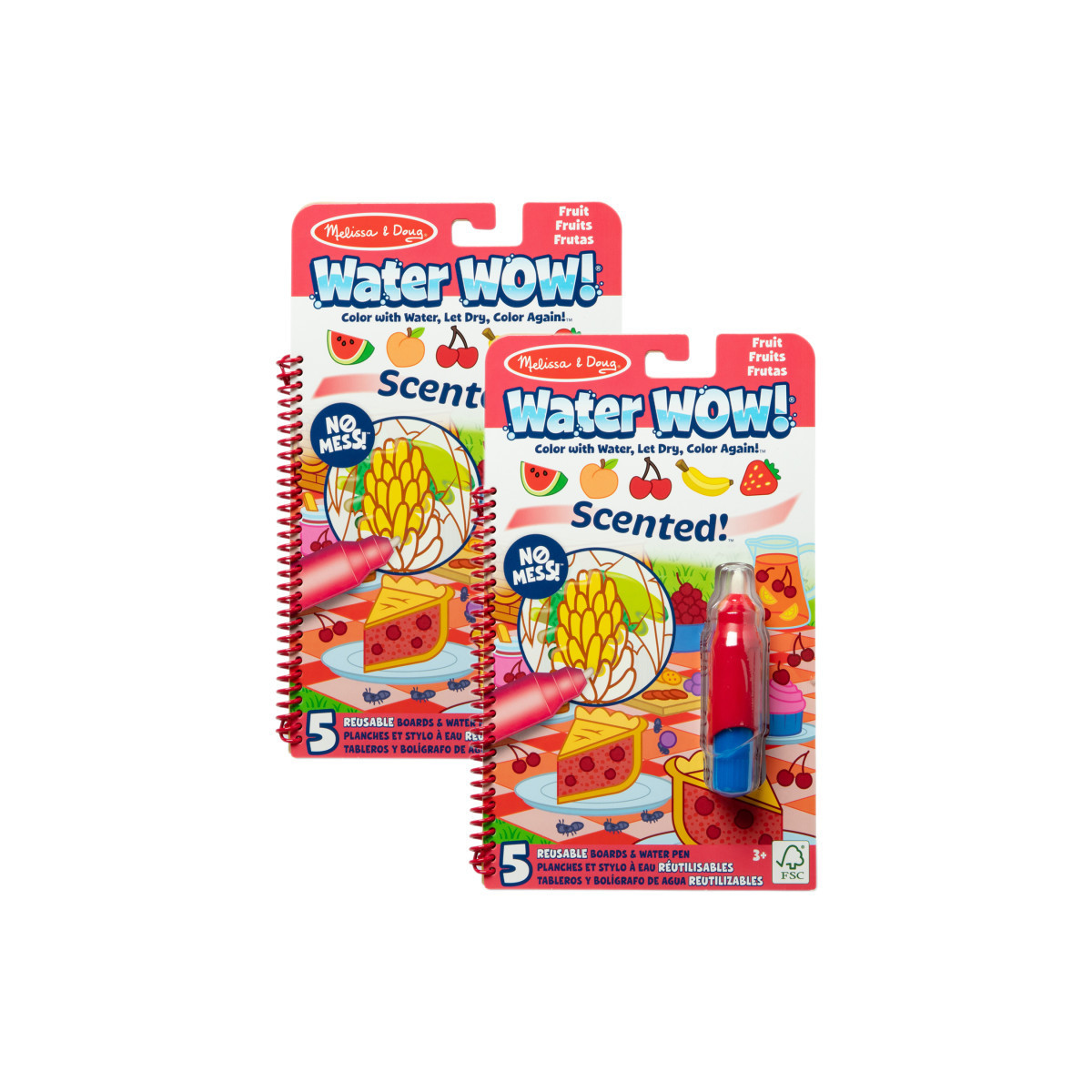 No-mess Water WOW! painting for kids now smells delicious! Each exciting scented paint-with-water coloring book includes five reusable pages and a refillable water pen. Use the pen to color in each scene and scents, details, and vibrant colors appear with every stroke! Let the page dry to erase the pictures and color it in again and again. This fruit-themed spiral-bound book includes five scent-filled scenes to color (watermelon, peach, cherry, banana, strawberry) and search-and-find activities for each scene. The chunky-sized water pen is easy to hold and stores neatly right in the front cover, making this scented Water WOW! an ideal activity book and travel toy for kids! Sold as a pack of 2 coloring books, each with water pen.
