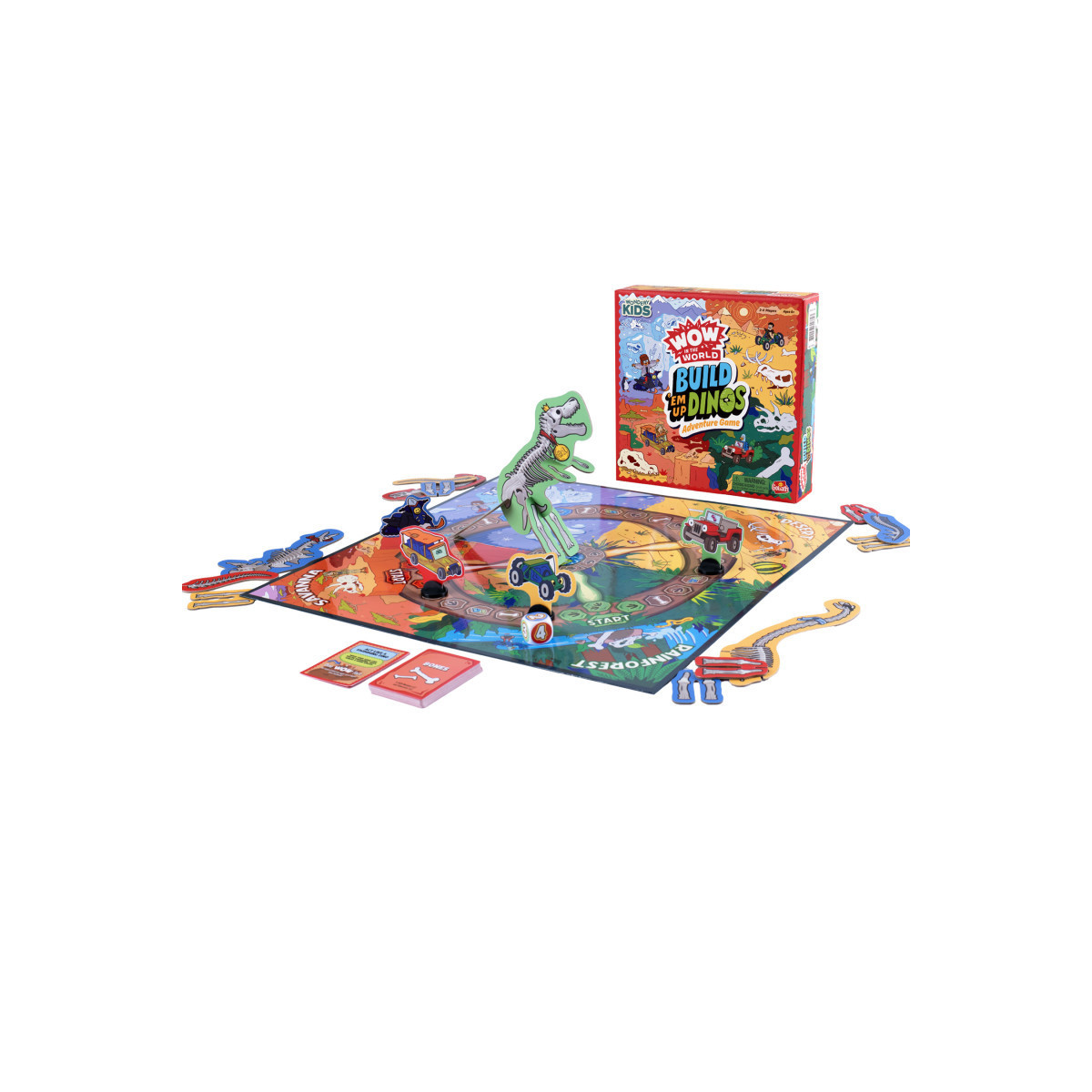 Join your favorite "WOW in the World" hosts, Guy and Mindy, on a dino-sized adventure around the globe! You’ll explore all corners of the earth, from the tundra to the rainforest to the desert to the savanna. Along the way, you’ll get to act like a dinosaur and learn some of the craziest dino facts you’ve ever heard. Be the first paleontologist to build your completed dino and deliver it to the center of the board to win!