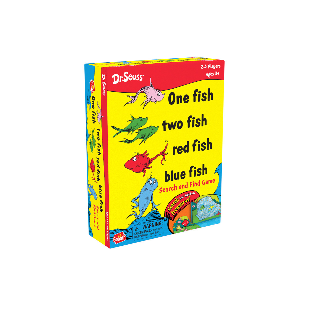 With millions of books sold, explore a new way to enjoy this beloved children's book series! Spin the spinner to see what you're looking for - two red fish? Three blue fish? Shake the box and starting looking! The "water* moves around behind a clear window. revealing different colored fishies and even some Seussical surprises. Just spin, find, and collect your cards to win!
