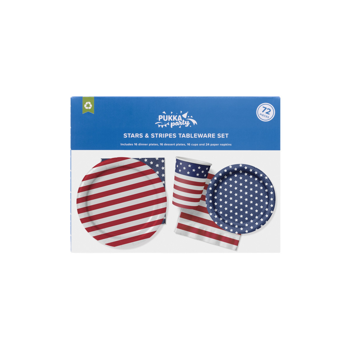 Celebrate your next BBQ, 4th of July, or summer gathering in patriotic style with the Pukka Party Stars & Stripes Tableware Set! This 72-piece set includes 16 9" dinner plates, 16 7" dessert plates, 16 9oz cups, and 24 2-ply napkins, all featuring a bold red, white, and blue stars-and-stripes design. Perfect for indoor or outdoor celebrations, each piece is made from eco-friendly, recyclable materials, making setup and cleanup effortless. Bright, coordinated, and festive, this tableware collection brings a classic American touch to your party while keeping things simple and stylish.
