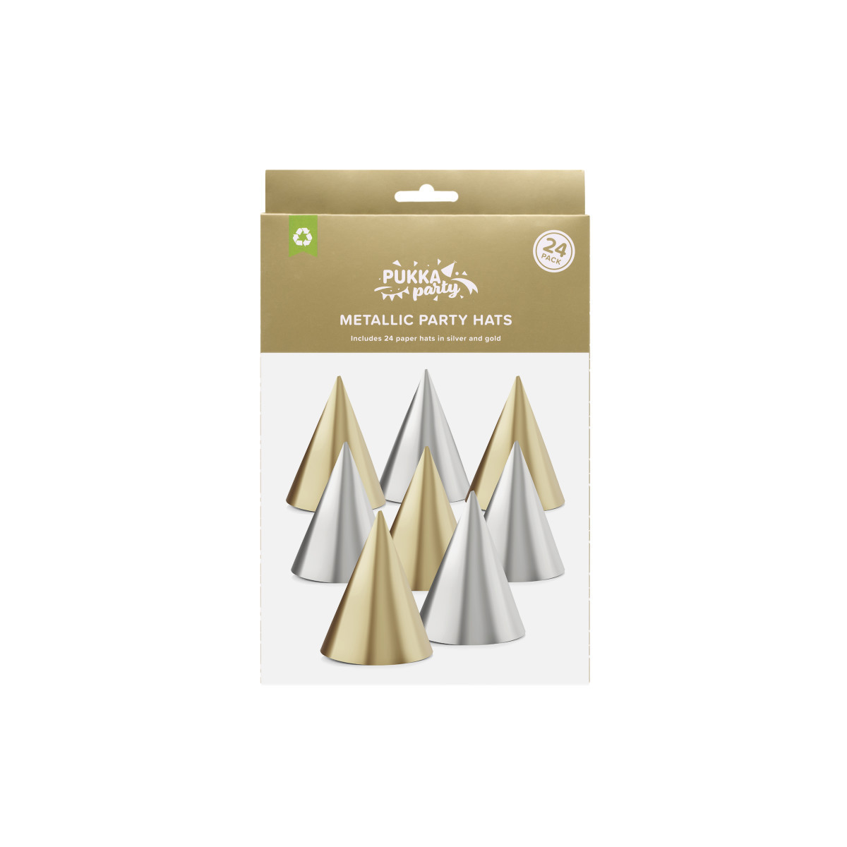 Elevate your celebration with the Pukka Party Metallic Party Hats, a stylish 24-pack designed to add instant sparkle to any occasion! Featuring a mix of shimmering silver and gold foil-finish cone hats, these party accessories bring a luxe, festive touch perfect for birthdays, New Year's Eve, or elegant gatherings. Crafted from durable card, each hat comes with a comfortable elastic cord to keep it securely in place for guests of all ages. Flat-packed for easy storage and quick assembly, these metallic hats make party prep simple and stress-free. With their classic cone shape and dazzling shine, they create a fun yet sophisticated vibe, ensuring your guests look and feel festive while making unforgettable memories.