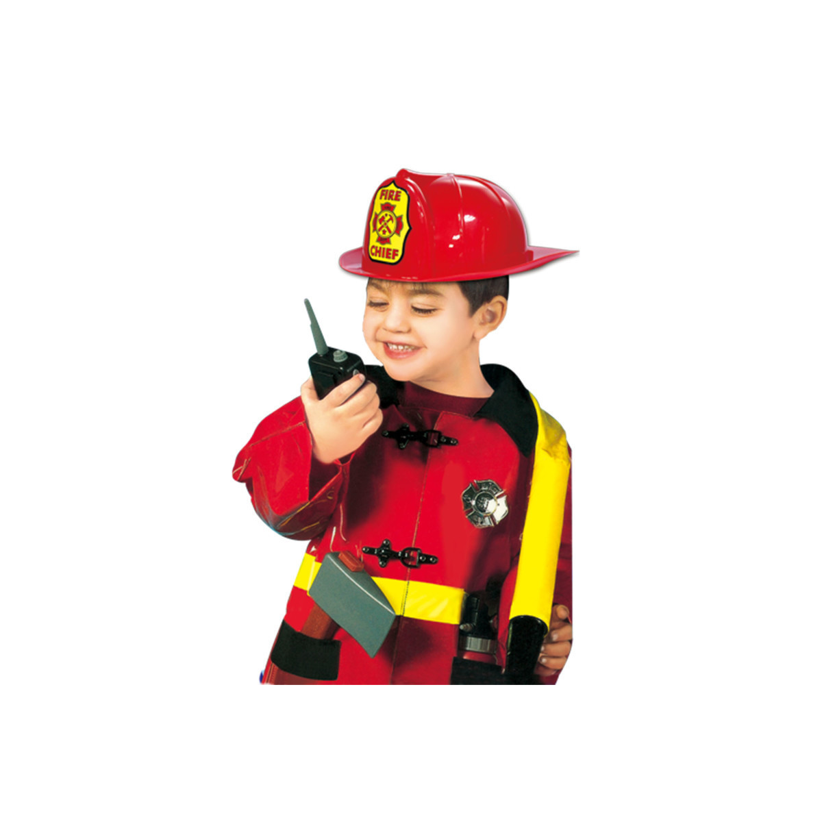 - Complete Firefighter Set – Includes coat, badge, fire hose, axe, walkie talkie, squirting fire extinguisher, and hard helmet.