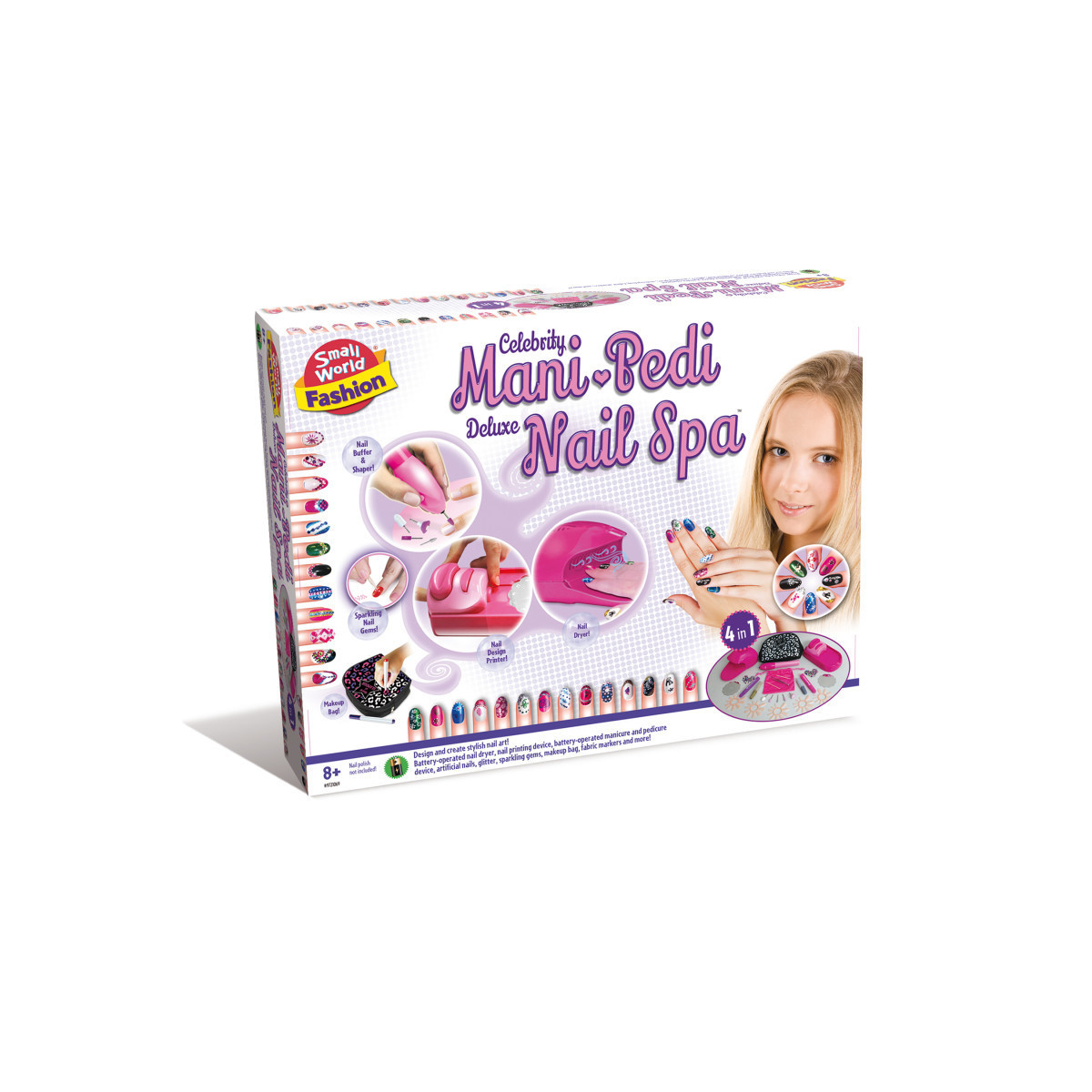 Transform any day into a glamorous spa experience with the Celebrity Mani Pedi Deluxe Nail Spa. This all-in-one nail kit includes three professional-style devices that let you pamper your fingers and toes just like at a salon. Shape your nails, treat your cuticles, buff them to a brilliant shine, then add color and creativity with nail polish, glitter, and unique printed designs. The included nail dryer ensures your manicure or pedicure sets in minutes, making it quick, fun, and easy to achieve flawless nails every time. With everything needed for a complete fashion makeover, this deluxe nail spa is perfect for kids ages 8 and up who love beauty, fashion, and creative play.
