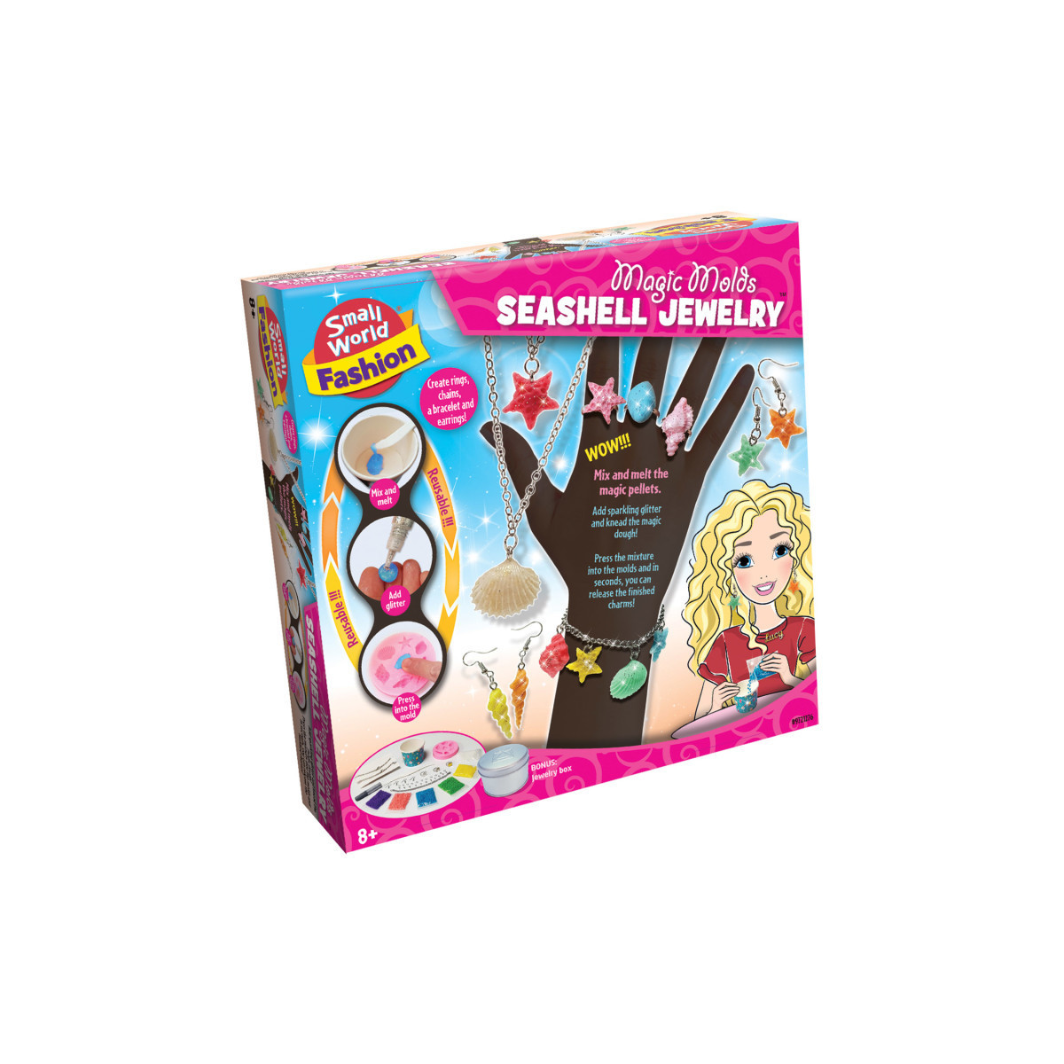 Create sparkling, personalized jewelry with the Magic Molds Seashelly Jewelry Kit, a fun and engaging DIY craft set for kids ages 8 and up. This all-in-one kit lets children mix and melt magic pellets, add glitter, and knead the magical dough to create dazzling seashell charms. Press the mixture into the included molds, and in seconds, release beautifully finished charms ready to wear or display. With all supplies included, this kit offers hours of creative fun while fostering fine motor skills, imagination, and a love for fashion and jewelry design.